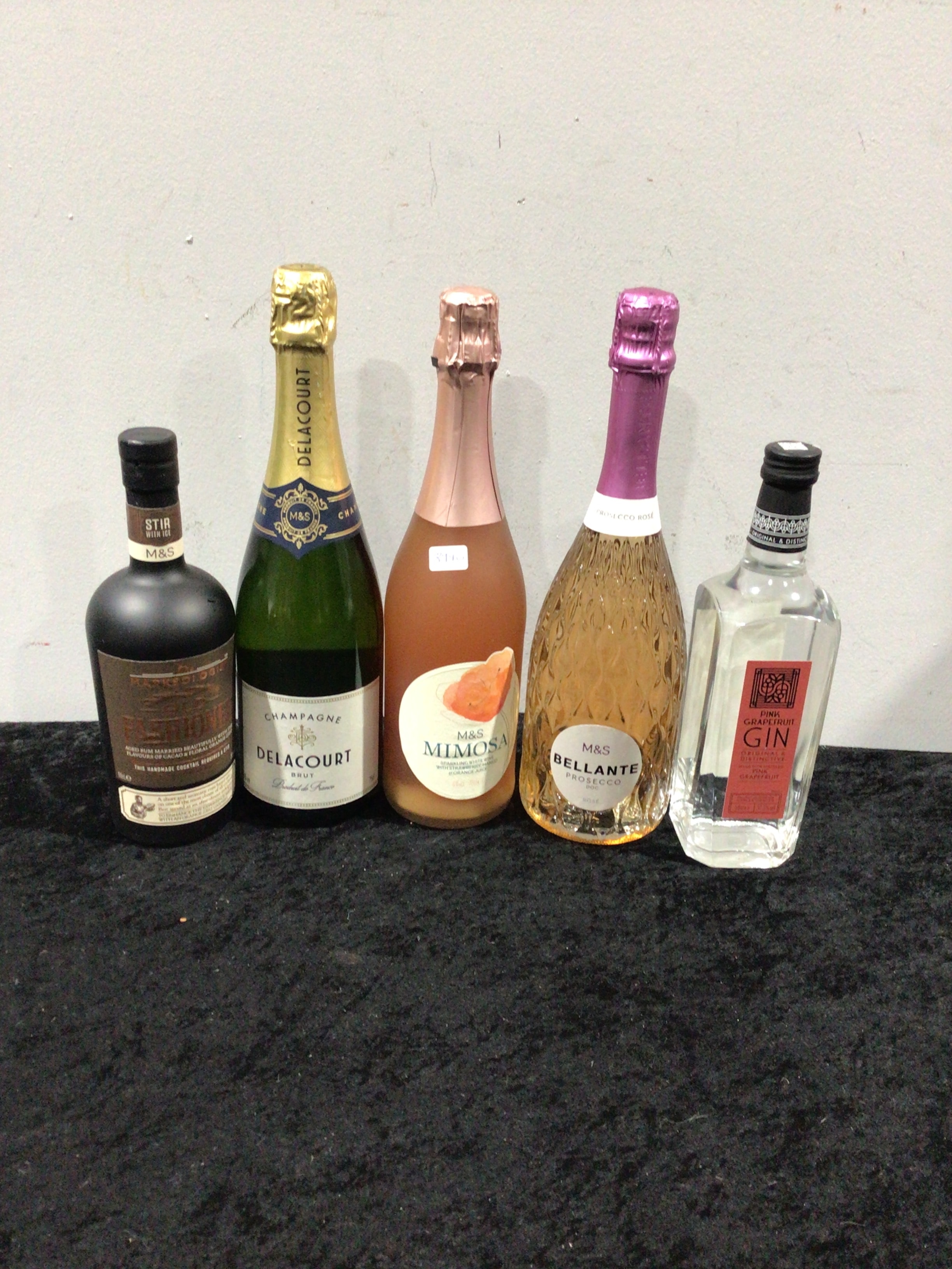 The lot comprises five contemporary, full, and sealed glass bottles of various M&S alcoholic beverages. All appear in excellent condition with intact labels and closures. The collection includes: a dark, squat M&S ‘Stir with Ice’ Aged Rum cocktail; a standard green champagne-style bottle of M&S ‘Delacourt Brut Champagne’ with gold foil; an M&S ‘Mimosa’ (sparkling white wine with strawberry and orange juice) in a clear champagne-style bottle with rose gold foil; a textured clear glass M&S ‘Bellante Prosecco DOC Rosé’ with a purple foil neck; and a rectangular clear glass bottle of M&S ‘Pink Grapefruit Gin’. The labels prominently feature the ‘M&S’ branding across all items, indicating their retail origin.