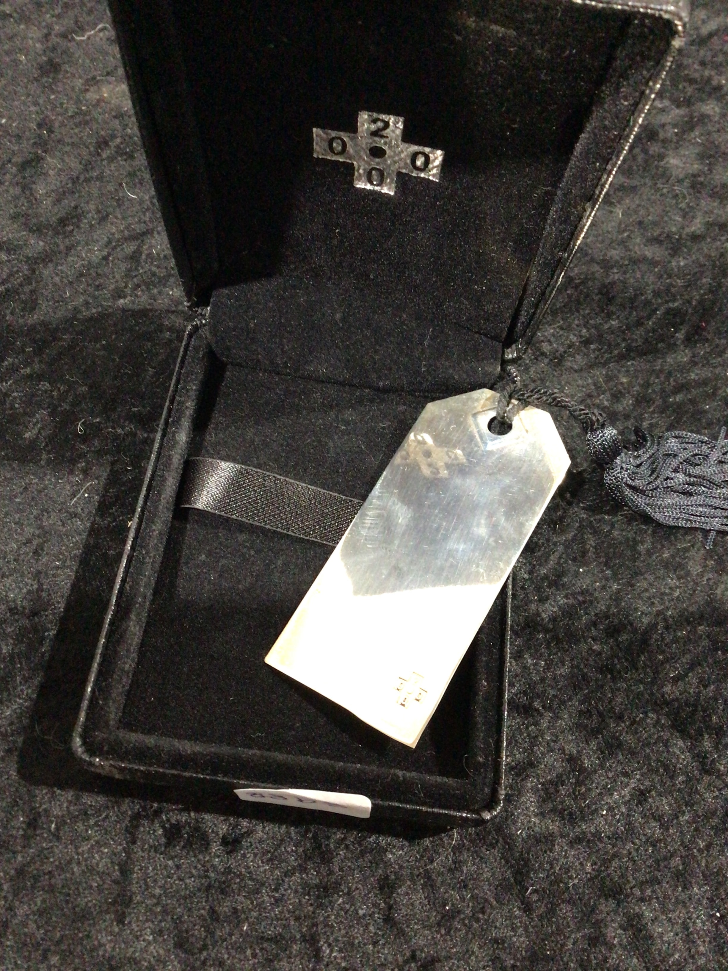 A modern-style presentation ensemble comprising a rectangular, polished sterling silver bookmark, attached to a black braided cord terminating in a tassel. The bookmark features a small, stylized grid of squares as a marking near its bottom edge. It is housed within a black velvet-lined box, the interior lid of which displays a small, cross-shaped metallic emblem inscribed with the numbers “0 2 0 0”. Both the box’s exterior and interior lining are made of a black velvet-like material.