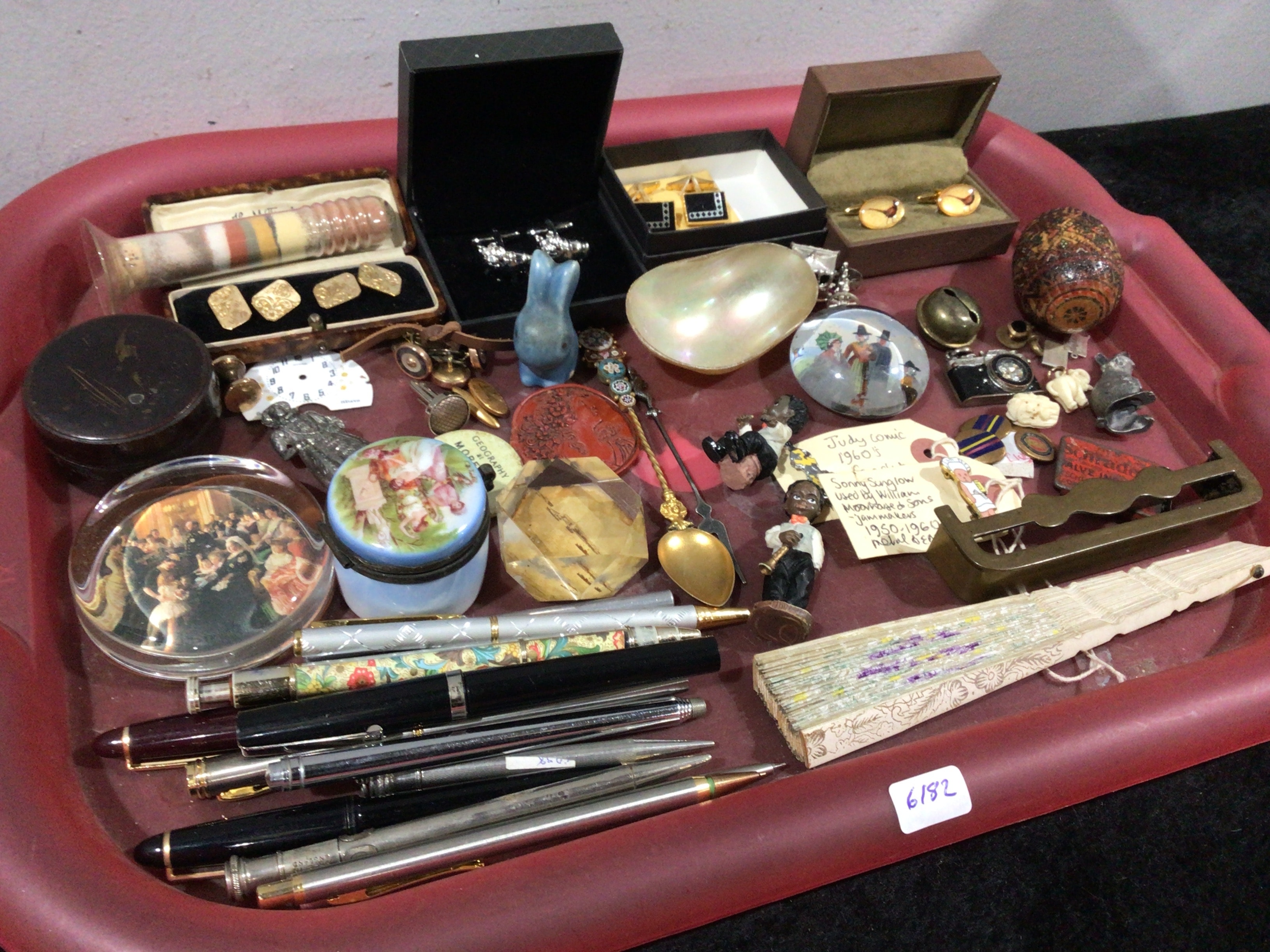 A diverse collection of decorative and functional objects, primarily dating from the mid-20th century and later. The assortment includes multiple pairs of cufflinks, featuring silver-tone, gold-tone, and black enamel designs, some presented in their original boxes. A collection of approximately ten fountain and rollerball pens are present, with various metal finishes including silver and gold-tone, some with patterned barrels, and one notably featuring a ‘PARKER’ clip. Also included are two painted figures depicting musicians in ‘blackamoor’ style, identified by an accompanying tag as ‘Judy Comic 1960’s, Sonny Singlow used by William Moorcroft & Sons – Jammakers 1950-1960 metal & Geo’. The collection further comprises several glass paperweights, one depicting a ballroom scene, another with two figures, and a faceted clear/amber piece. Additional items include a round porcelain box with a hand-painted pastoral scene, a large iridescent mother-of-pearl object, an ornate gold-tone spoon, a white folding fan with floral decoration, a carved wooden egg, a small camera, a dark brown lacquered box, and various small charms or pins, including an ivory-colored elephant and a grey metal rabbit. Further items include a circular object marked ‘GEOGRAPHY MORE’, a partially visible ‘SCHRADE’ box, a mosaic-style bracelet, and a heavy brass-colored metal object. All items are presented within a red-toned tray marked ‘6182’.