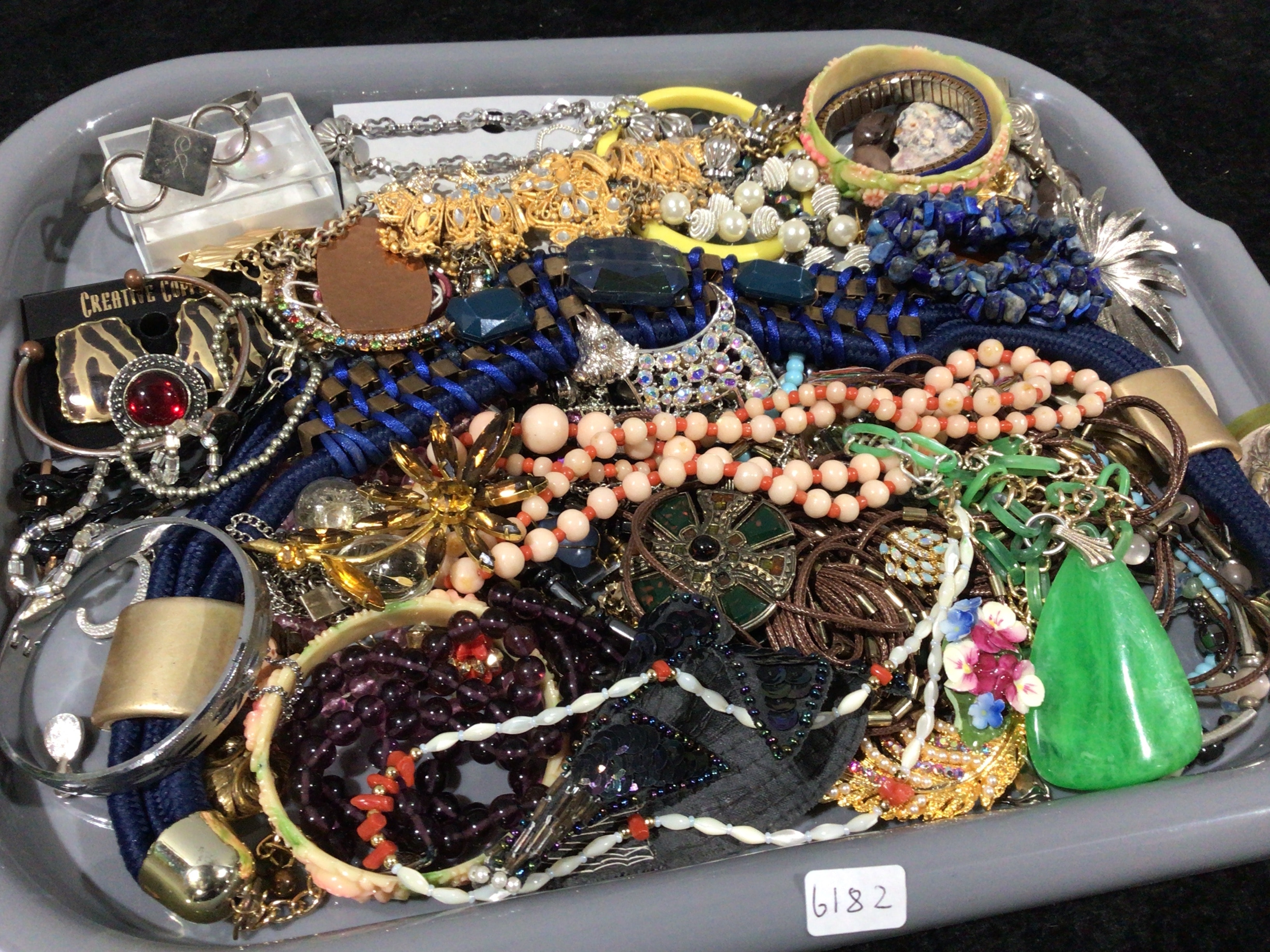 A collection of costume jewelry, encompassing numerous necklaces, bracelets, and various brooches or pendants, all contained within a grey tray. The items exhibit a mix of styles, ranging from mid-20th century to contemporary, and are fabricated from an assortment of materials including silver-tone and gold-tone metals, faux pearls, glass and plastic beads (notably opaque blue chips resembling lapis lazuli, peach-colored, and dark purple), clear rhinestones, and faceted opaque blue and red stones. Specific pieces include a silver-tone cuff bracelet engraved with the initial ‘P’, a multi-strand faux pearl necklace, a prominent bright green teardrop-shaped pendant, a yellow bangle, and a bracelet adorned with a carved cameo. A black tag partially visible reads “CREATIVE COPPER.” A white sticker in the bottom right corner displays the inventory number “6182”.