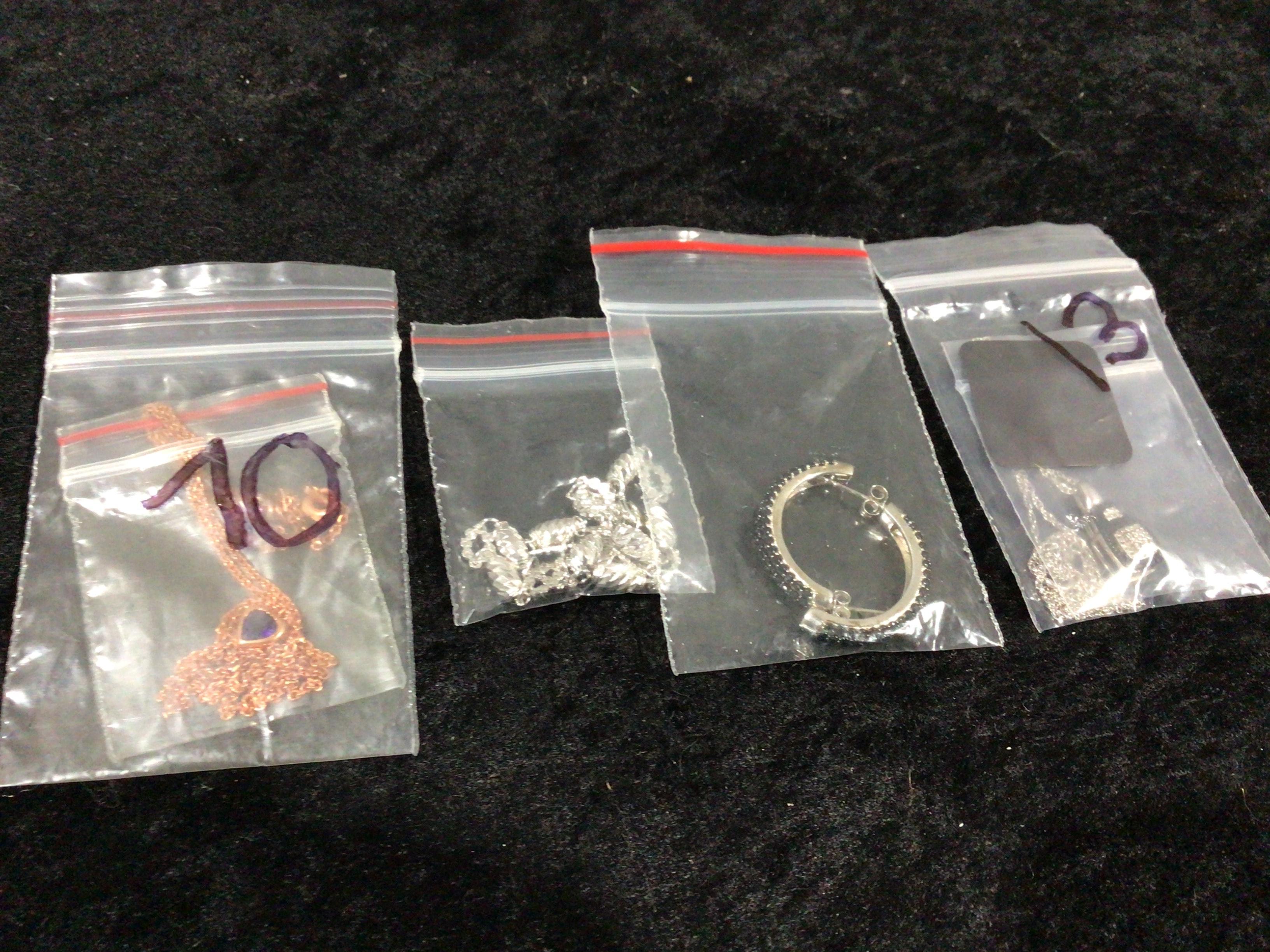 This lot comprises a group of four contemporary jewellery items, presented in individual re-sealable plastic bags. The leftmost bag, marked with the number ’10’ in purple marker, contains a rose gold-toned chain necklace with a heart-shaped or abstract pendant set with small, clear stones. The next bag holds several silver-toned chains, appearing somewhat tangled. The third bag features a single silver-toned hoop earring, extensively pave-set with numerous small, dark stones around its exterior. The final bag, marked with the number ‘3’ in purple marker, includes a silver-toned chain necklace with a rectangular pendant entirely pave-set with clear stones, alongside a dark, rectangular inventory or pricing tag. The items exhibit varying metal tones.