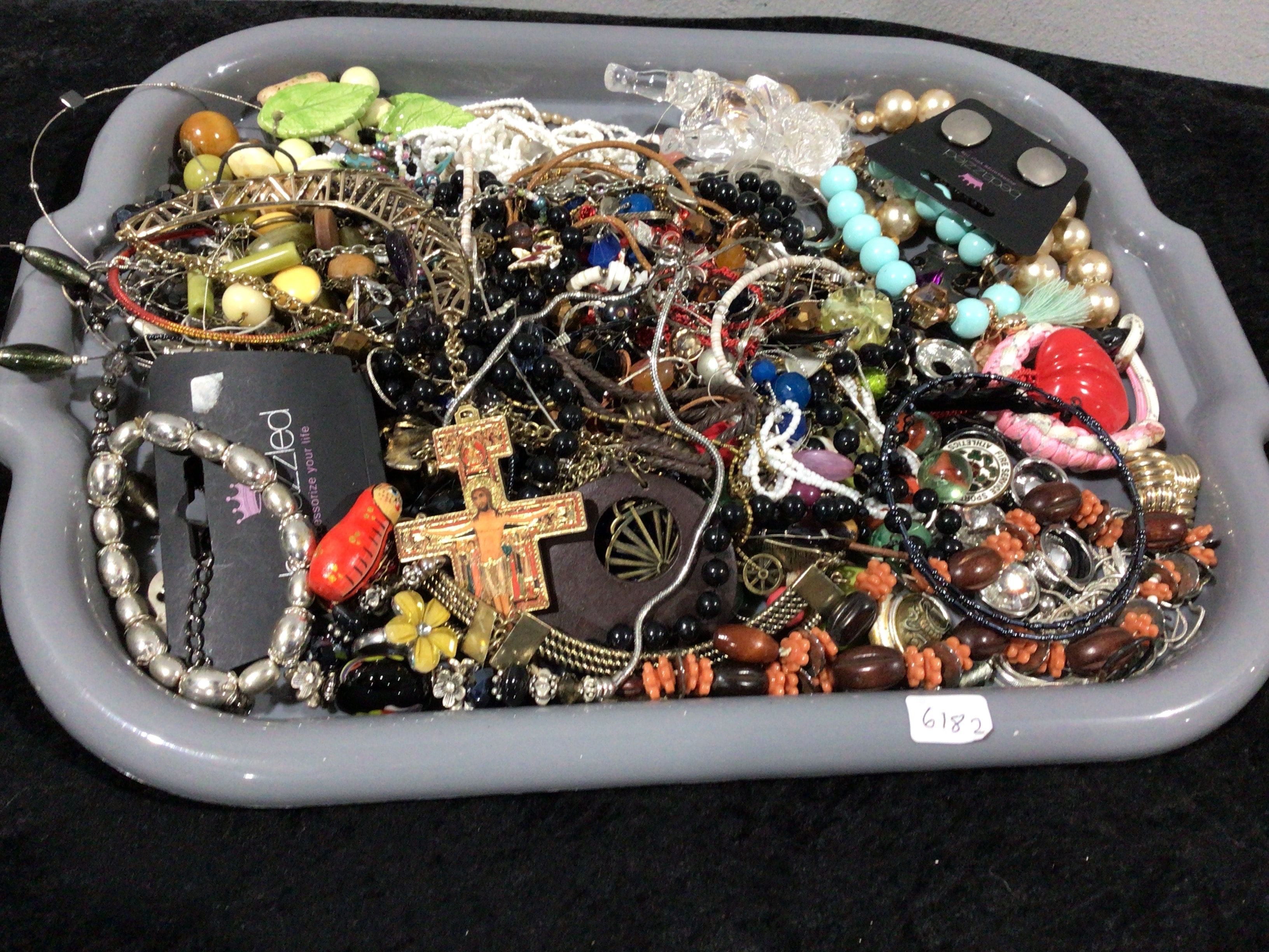 A diverse collection of costume jewelry and accessories presented within a gray plastic tray. The items exhibit a mixed style, ranging from modern retail pieces to potentially vintage-inspired designs. The collection includes numerous necklaces, bracelets, earrings, and pendants. Various materials are evident, such as gold-tone and silver-tone metals, an assortment of glass and plastic beads in multiple colors including black, turquoise, white, amber, and red, faux pearls, wood, enamel, cord, and clear plastic or crystal-like elements. Notable items include two black retail cards for “beadazzled” with the slogan “accessorize your life,” accompanying a pair of silver-tone stud earrings and a beaded bracelet. Also present is a prominent gold-tone crucifix pendant featuring a detailed religious image, a small red painted wooden charm, a circular medallion marked “ATHLETIC FIRE SERVICE SPORTS,” and various rings and brooches. A white sticker on the tray edge displays the number “6182.”