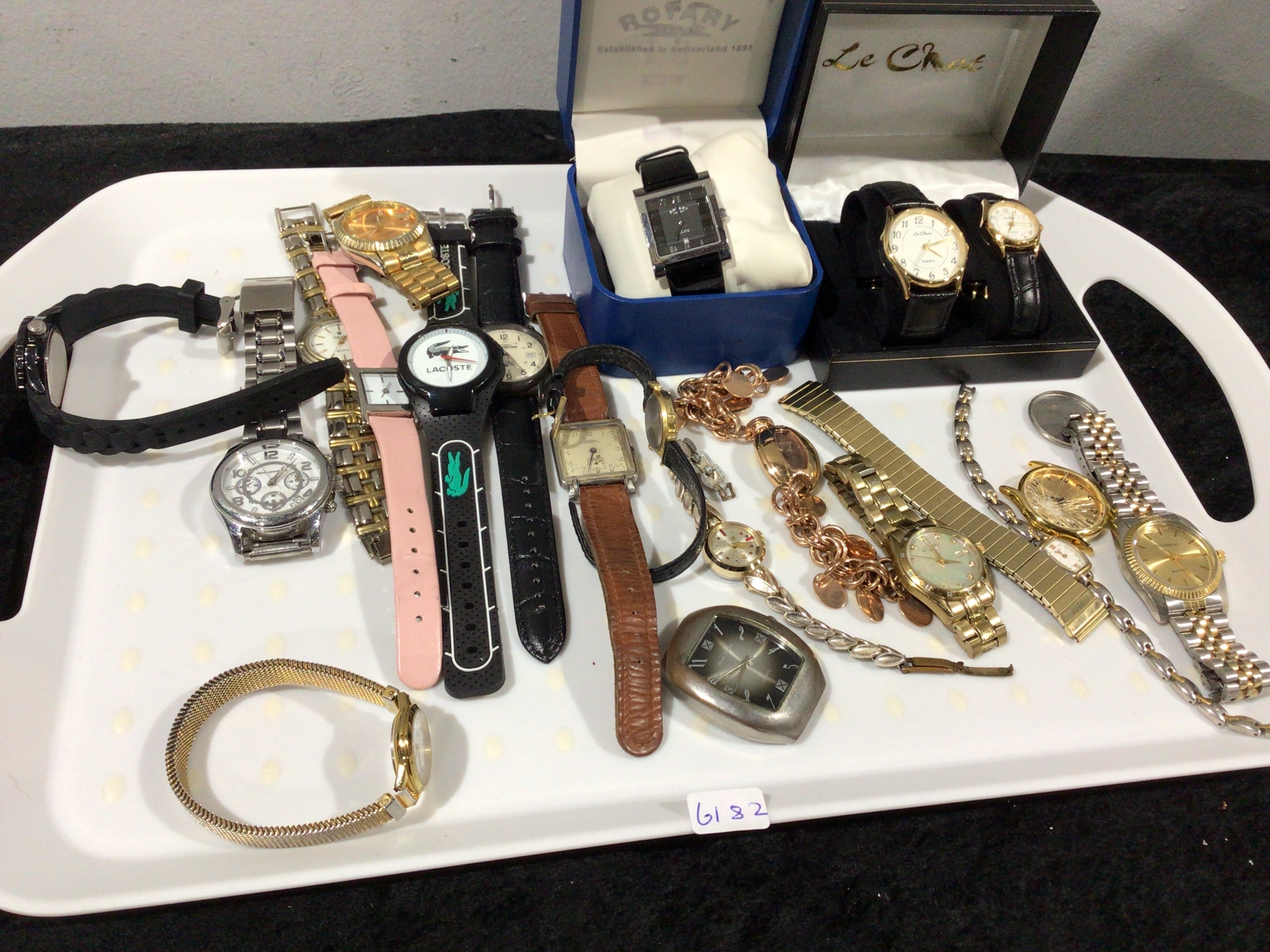 A collection of assorted wristwatches, primarily for men and women, presented on a white tray. The lot comprises approximately two dozen timepieces, including two watches displayed in their original boxes, one marked “ROTARY” and the other “Le Chéval.” Styles vary from classic round and rectangular metal-cased designs with link or leather straps to a modern black silicone-strapped Lacoste watch featuring its signature crocodile logo. Materials predominantly include gold-tone, silver-tone, and two-tone metals, along with leather and rubber/silicone for straps. Visible brands include ROTARY (with one square watch marked “ELITE” and noting “Established in Switzerland 1895”), Le Chéval (on a black box and a gold-tone quartz watch), LACÔSTE, and Paul Marean or Paul Moreau. A small label on the tray is marked “6182.”