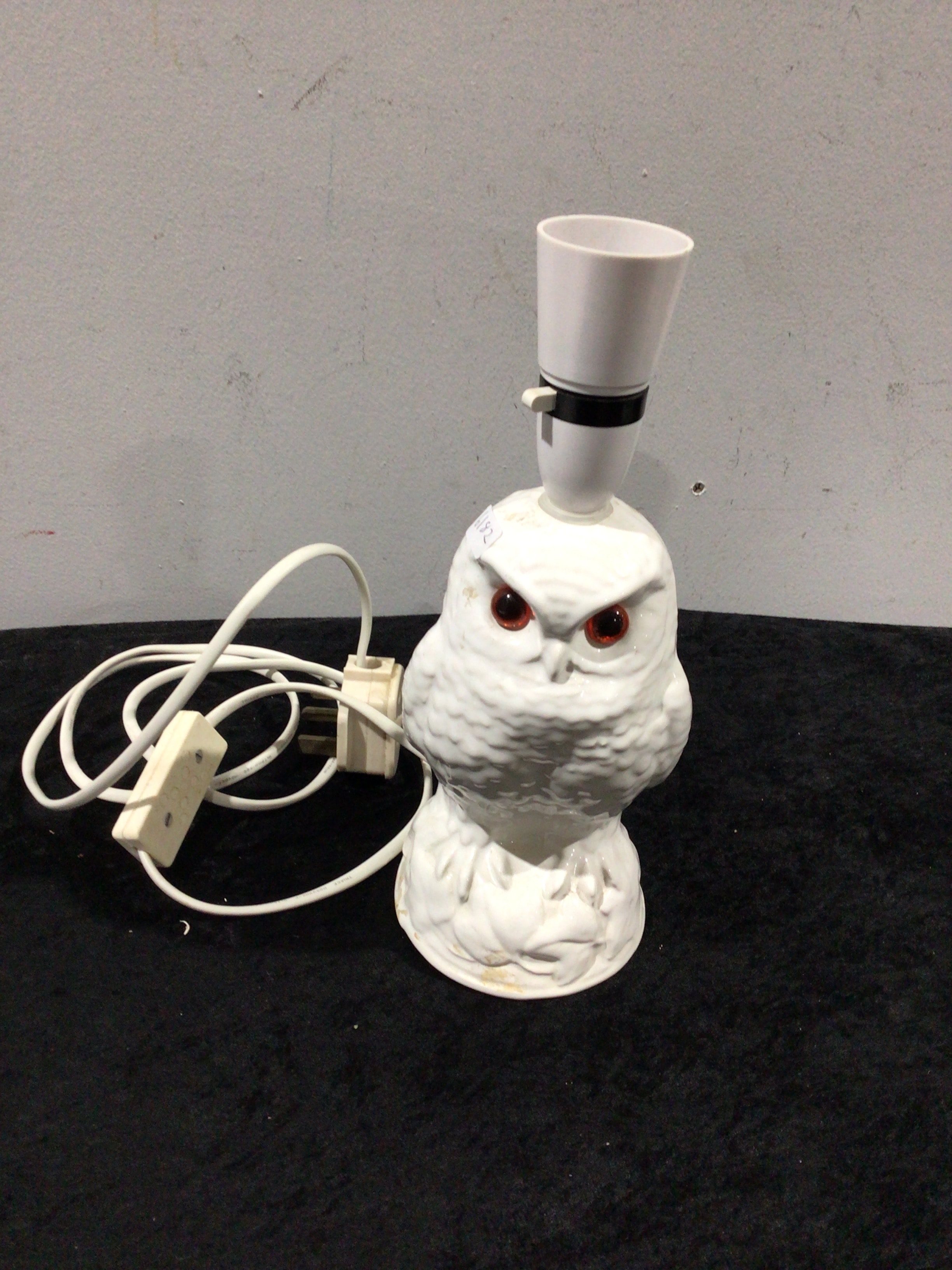 A figural table lamp by Poole Pottery, featuring a white glazed ceramic or porcelain owl-shaped base with textured detailing and prominent reddish-orange eyes. It is equipped with a white plastic bulb holder, a white electrical cord with an inline switch, and a two-pin plug, on which faint, illegible embossed text is present. A white adhesive label with the handwritten number ‘182’ is visible on the side of the owl’s head.