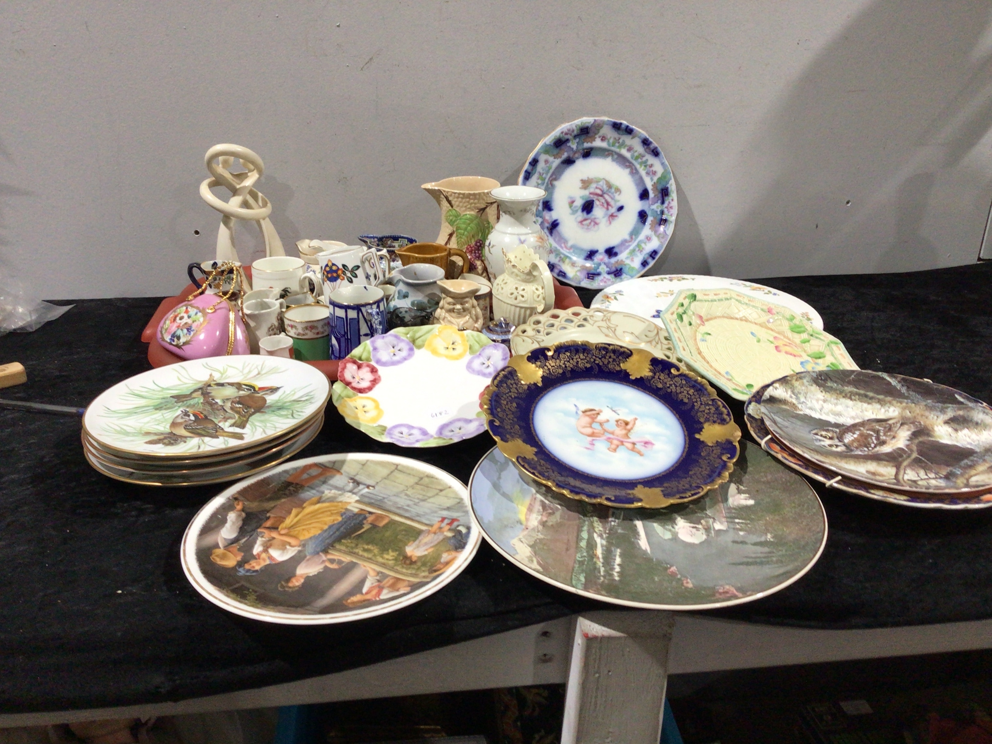A diverse collection of predominantly ceramic and porcelain items, likely dating from the 20th century. The lot comprises numerous decorative plates, including an ornate dark blue example with a central image of cherubs surrounded by extensive gilt decoration. Other plates feature realistic bird and nature scenes, colorful floral motifs (such as pansies on one plate marked “6182” in black hand-script), and a variety of abstract or geometric patterns. Also included are various smaller vessels such as pitchers, mugs, and creamers, exhibiting different glazes, textures, and decorative elements. A tall, white, abstract sculptural object, possibly ceramic or resin, is visible towards the rear left.