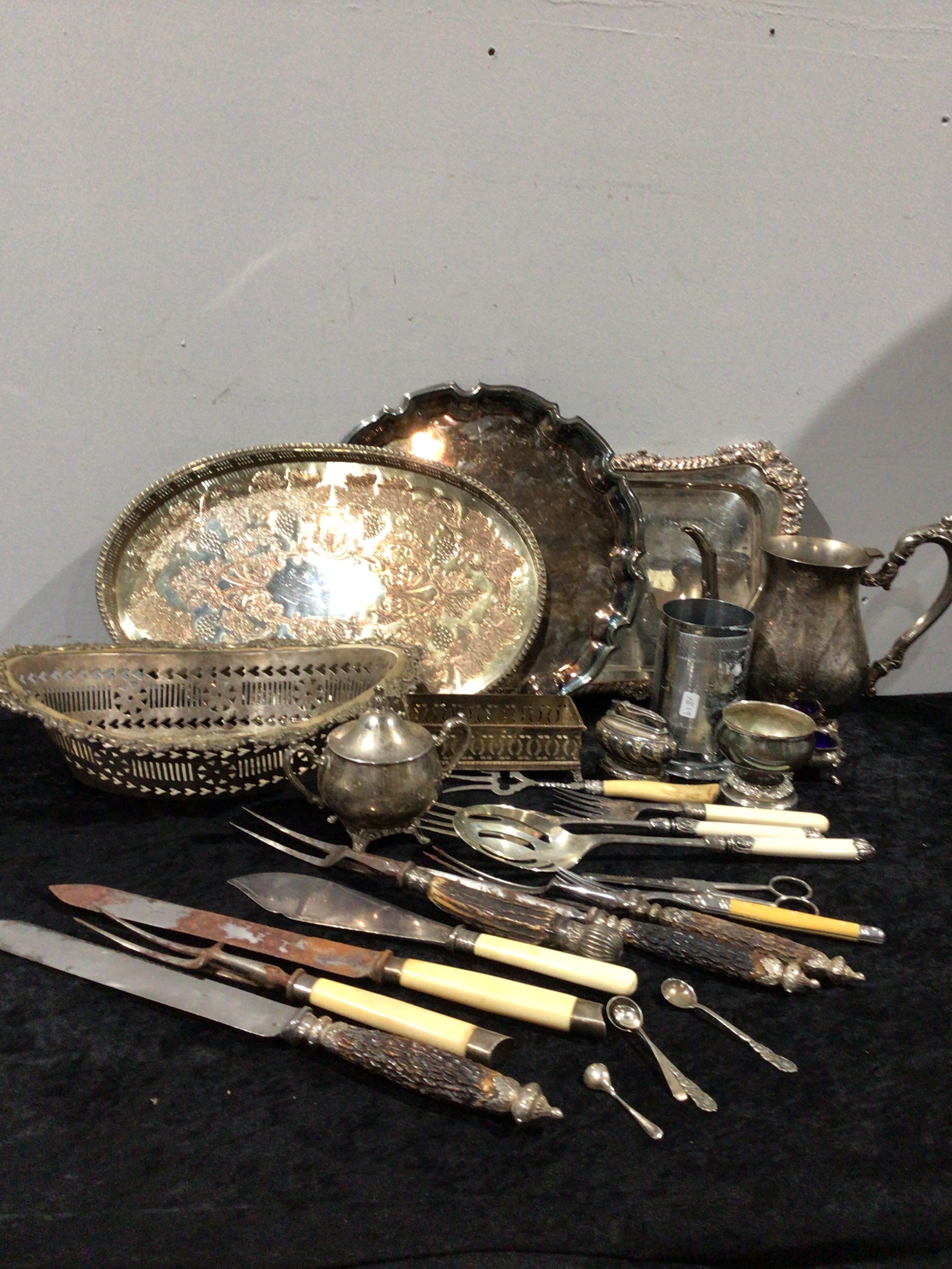 A collection of antique and vintage silver-colored metalware, predominantly silverplate, likely dating from the late 19th to early 20th century. The group includes several ornate serving trays, notably one oval tray with a prominent grape and vine motif, a pierced serving basket, a lidded sugar bowl, and various jugs or pitchers. Flatware components consist of multiple carving sets with natural handles, numerous forks, knives with light-colored handles (possibly bone or ivory substitutes), and an assortment of spoons and serving utensils, including a large slotted spoon. Also present are a small rectangular pierced metal box and a cylindrical cup with an illegible white sticker.