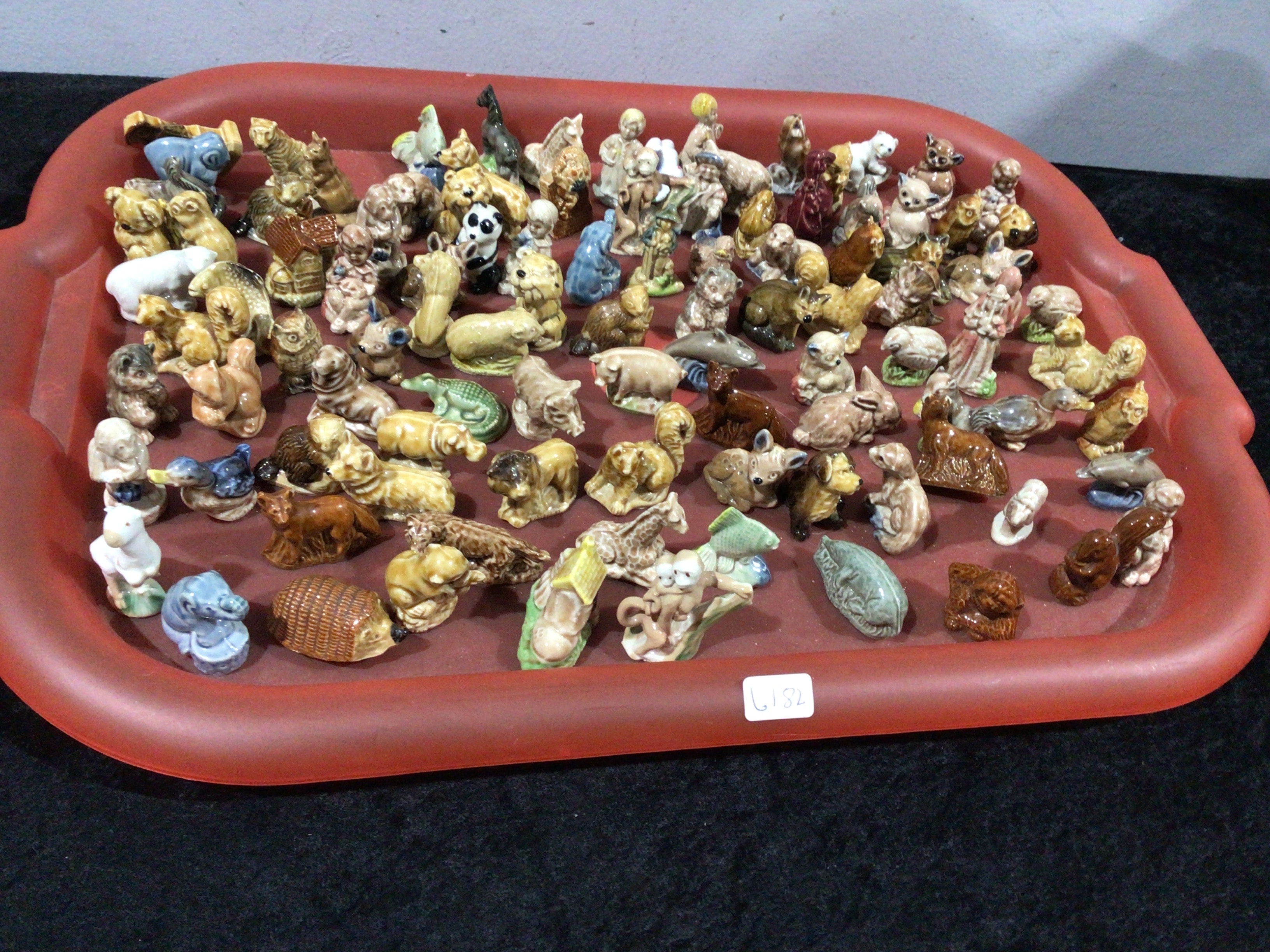 A collection of approximately one hundred Wade Whimsies Red Rose Tea glazed ceramic or porcelain figurines, primarily depicting a diverse array of animals such as bears, ducks, deer, rabbits, pandas, and marine life, alongside a few human-like figures, rendered in varied naturalistic and stylized color palettes. The individual pieces are casually arranged within a rectangular, red-orange plastic tray, which bears a white sticker handwritten with the number “6182”.