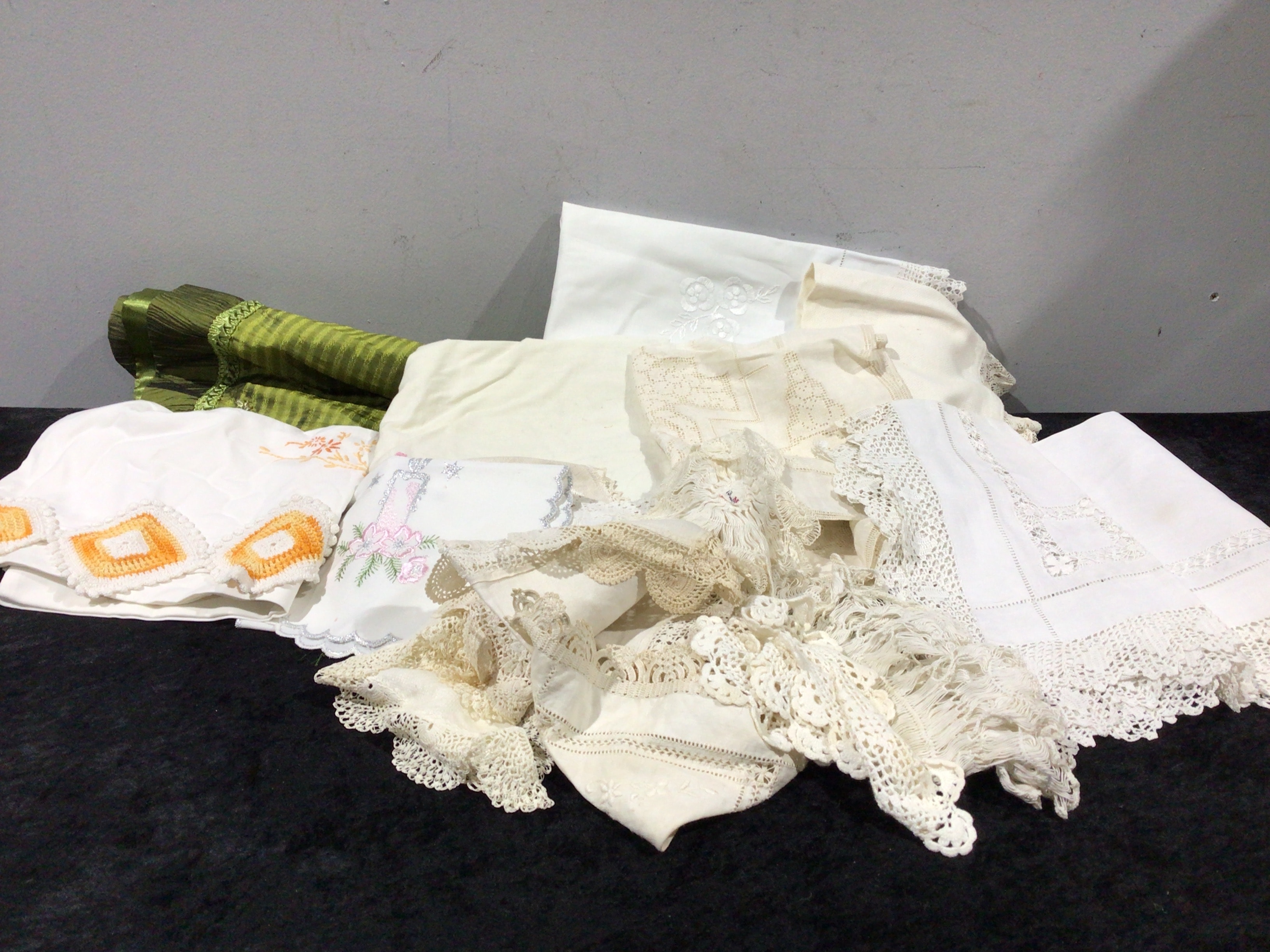 This lot comprises a large box containing various linen ware items. The collection primarily features white and cream-colored vintage textiles, predominantly cotton and linen. Handcrafts include intricate crocheted lace, cutwork, drawn thread work, and various embroidery styles such as white-on-white floral patterns and geometric designs. One item features a festive pink and silver candle motif. Also included is a rolled piece of green ribbed fabric with decorative trim.