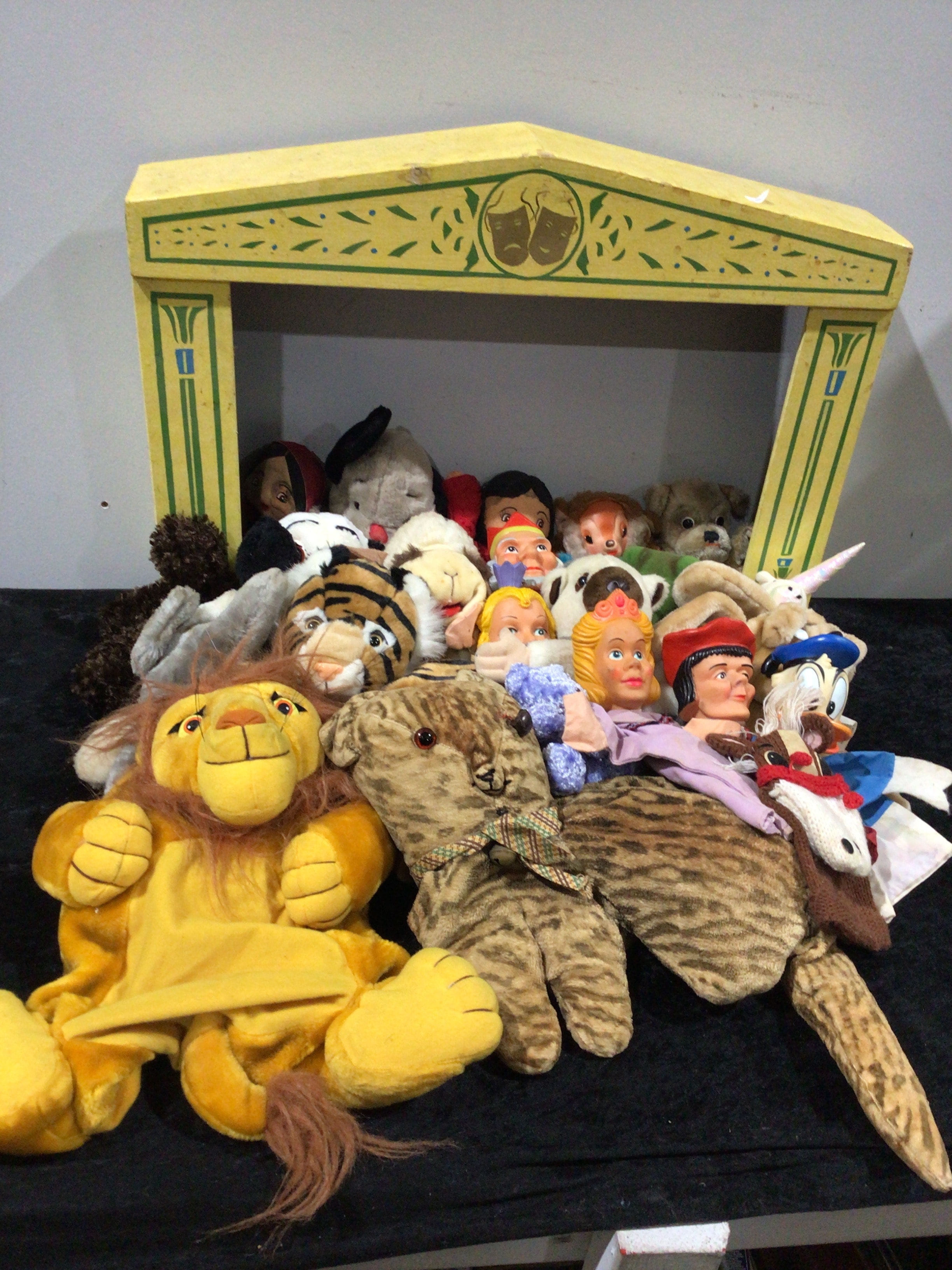 A Collection of Mid-to-Late 20th Century Hand Puppets and Plush Toys with a Wooden Puppet Stage