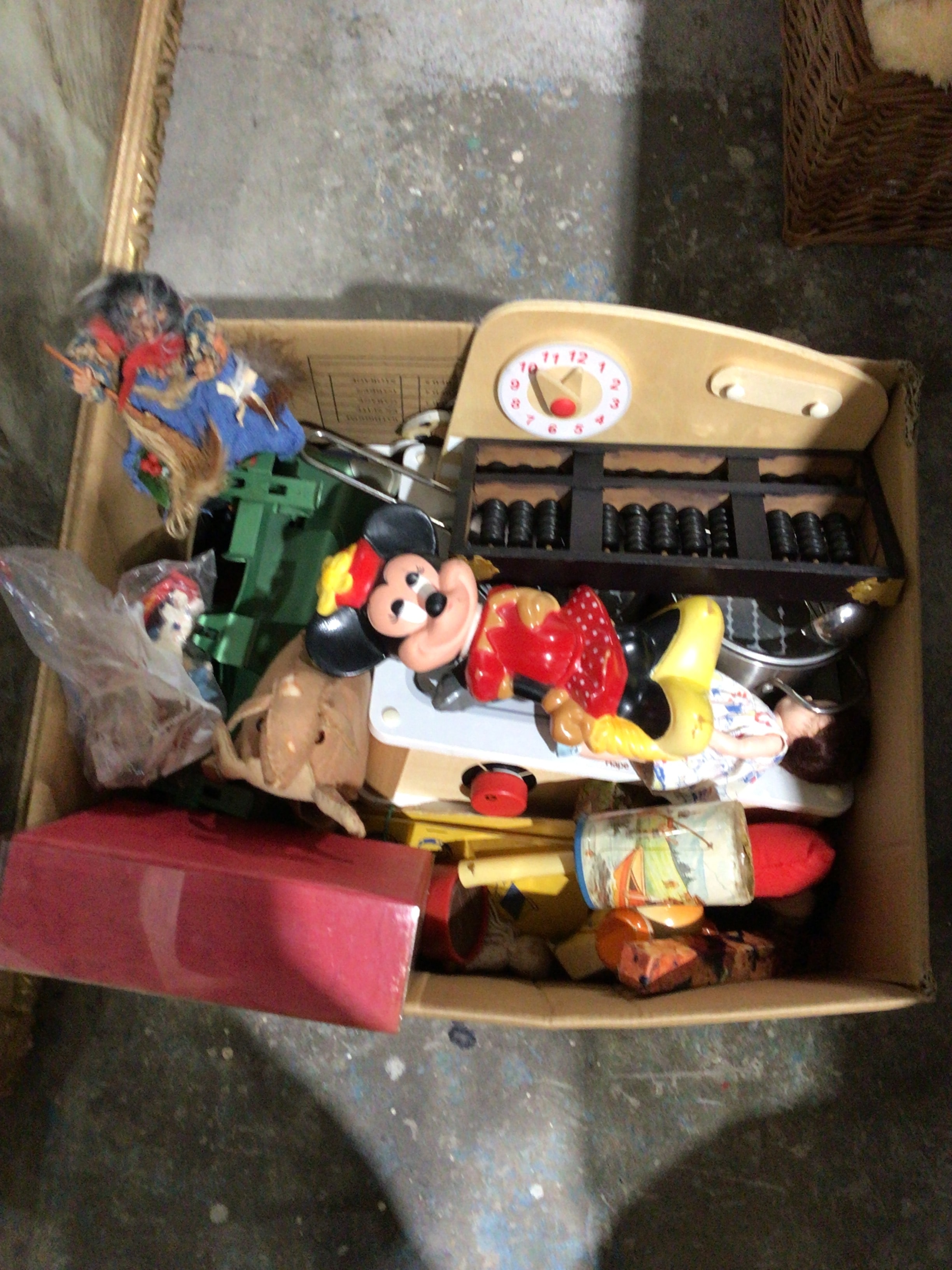 A varied assortment of children’s toys and decorative items, primarily dating from the mid-to-late 20th century. The collection includes plastic or rubber figures of Mickey Mouse in red shorts and Minnie Mouse in a red polka-dot dress. A wooden educational toy by Hape features a clock face with numbers 1-12 and an abacus with black beads. Further contents comprise a fabric witch doll on a broomstick, a light-skinned doll with dark hair, a tan stuffed animal, a green plastic vehicle, a red rectangular box, a small metal pot, various smaller play pieces, and a cylindrical container displaying a pastoral scene with a figure holding a fishing rod.