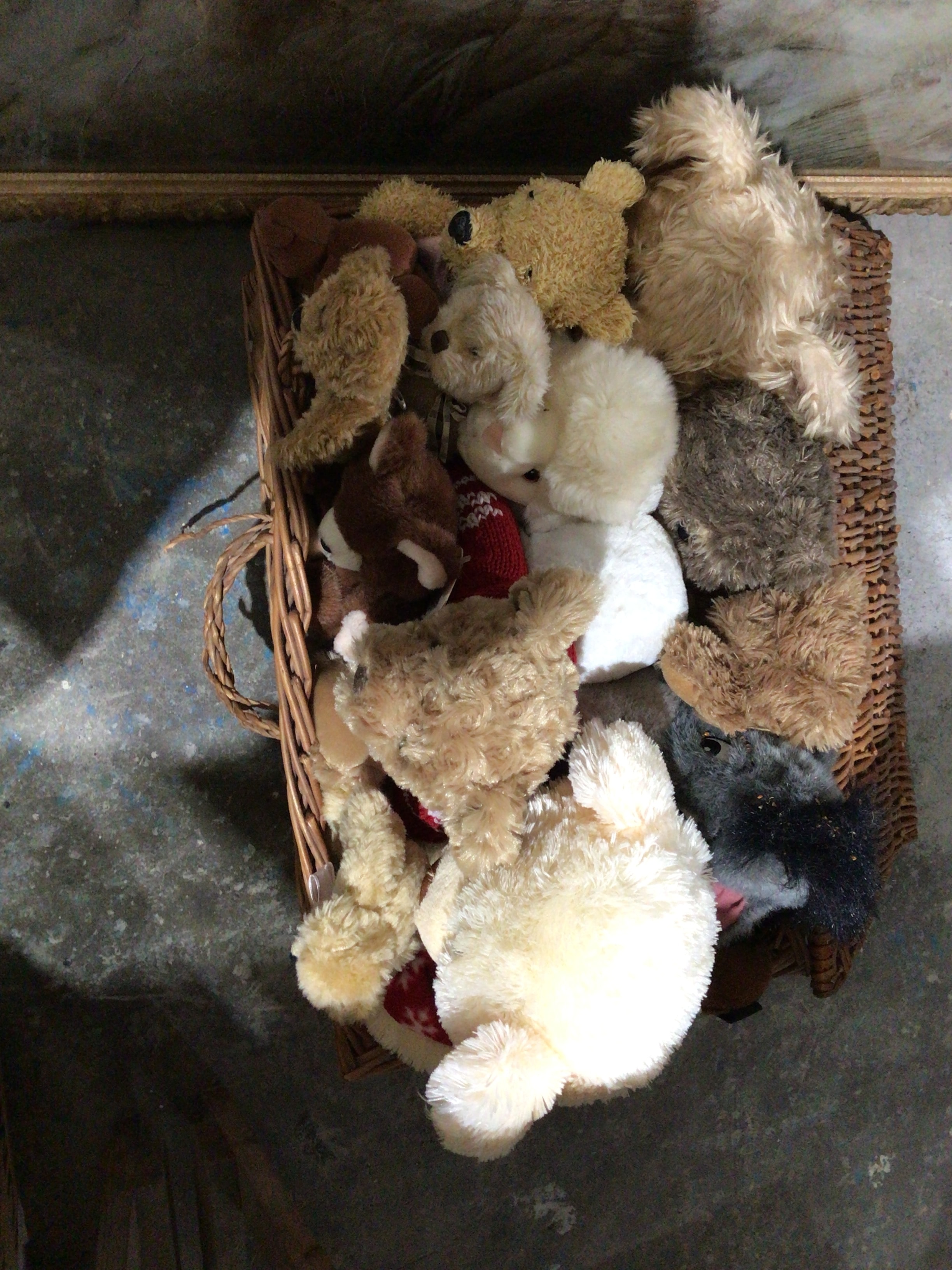 A Collection of Approximately Ten Plush Toys, including Teddy Bears, in a Wicker Basket
