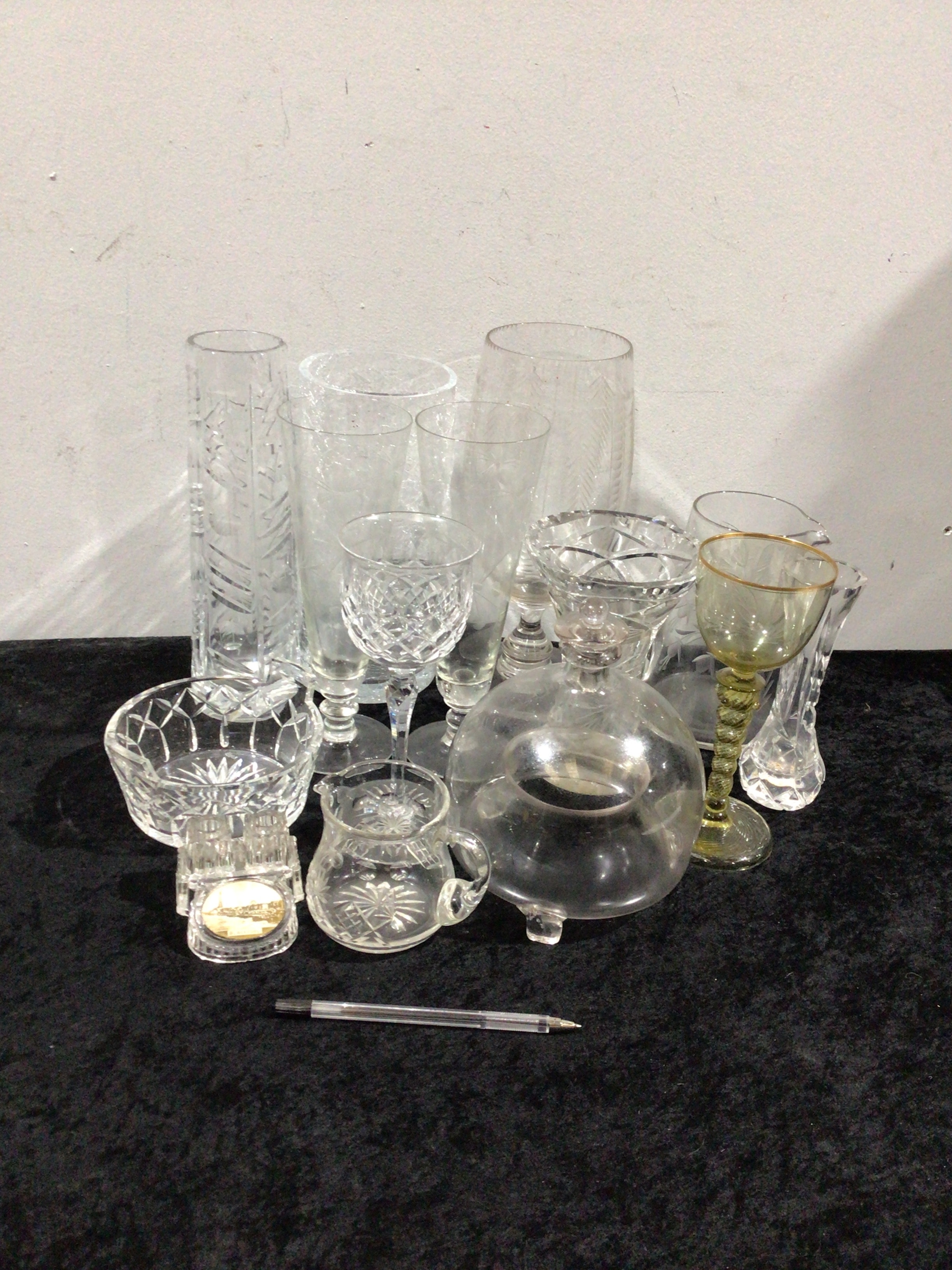 A collection of approximately thirteen clear and one tinted glass vessels, encompassing various forms. This assemblage includes several tall drinking glasses, some adorned with etched foliate designs; two stemmed glasses, one clear and one with a distinctive greenish tint, a twisted stem, and a gold-toned rim; a small creamer or pitcher featuring cut glass decoration; a footed decanter with an internal stopper; and a small cut glass bowl. A notable item within the collection is a small, multi-part clear glass structure, possibly a decorative holder, which incorporates a circular gold-toned insert depicting a tower-like landmark building. The varied styles, from intricate cut glass patterns to etched designs, suggest a mixed group of pieces likely spanning different decorative periods.
