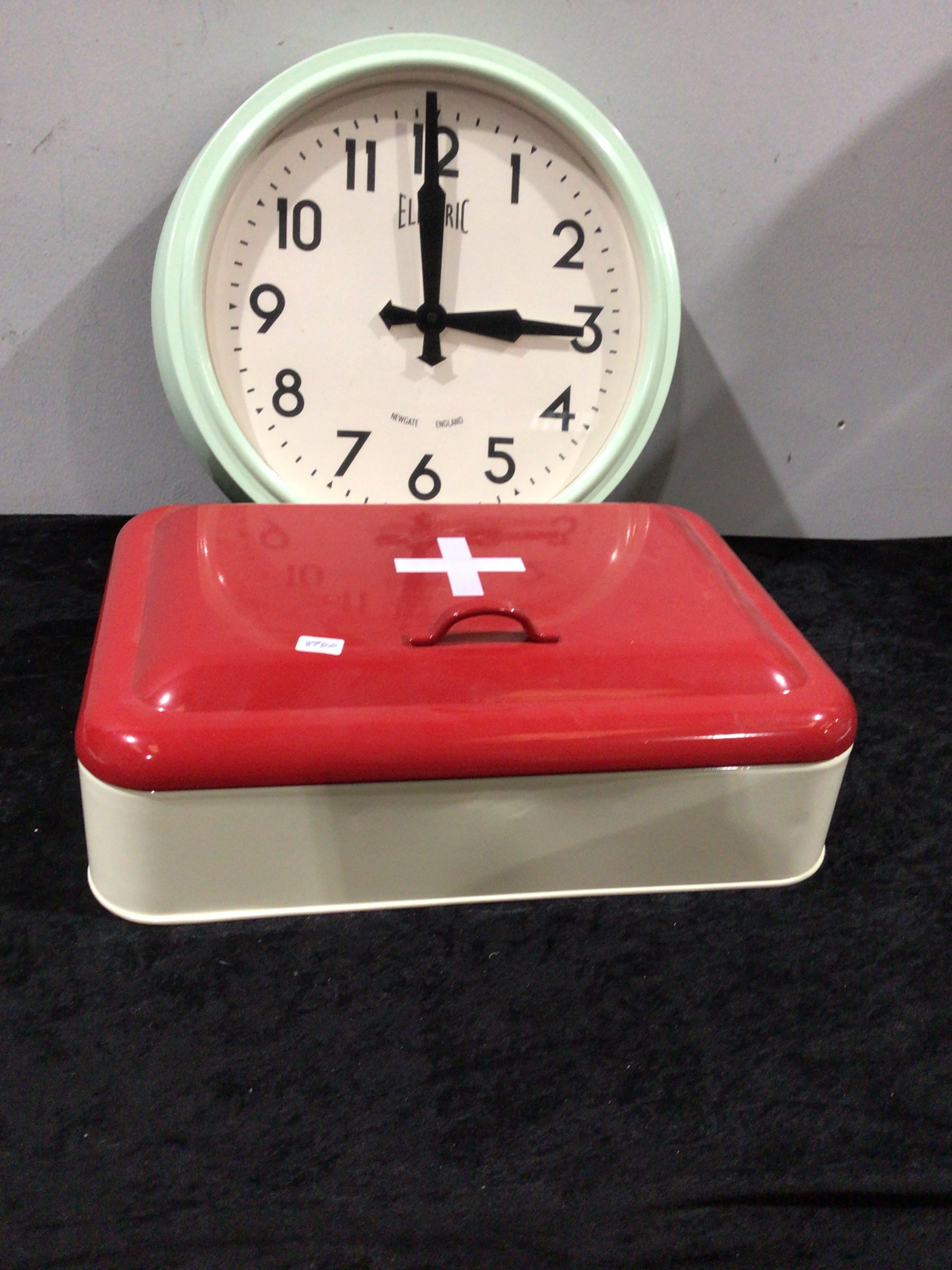 A Newgate England Electric Wall Clock and a Vintage Style Metal First Aid Box