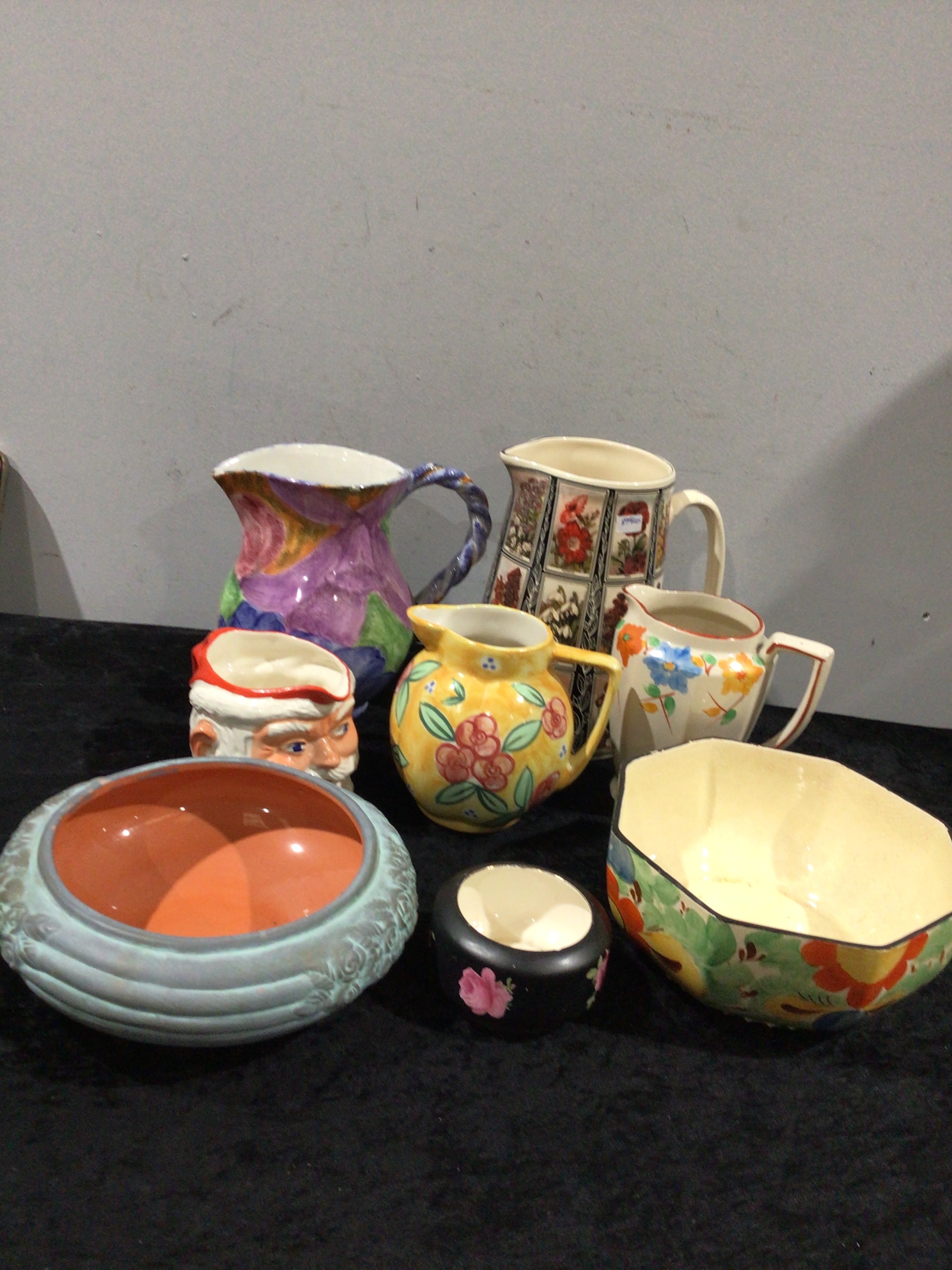 A collection of seven assorted ceramic vessels, primarily consisting of jugs and bowls of varying shapes and sizes, crafted from glazed pottery or earthenware. The collection is led by a large jug attributed to Charlotte Rhead for Crown Ducal, featuring a vibrant abstract purple and green ‘Persian’ design and a distinctive twisted handle. Accompanying this are a cream mug or tankard adorned with multiple framed botanical illustrations; a yellow jug with a red floral pattern; a smaller white creamer decorated with blue and orange flowers; a multi-faceted bowl embellished with green leaves and orange motifs; a light blue-green round bowl with an embossed design and an orange interior; a small black dish with pink roses; and a figural Santa Claus head creamer. The items display a diverse range of painted and relief decorations, suggesting a grouping from the mid-20th century to contemporary periods.