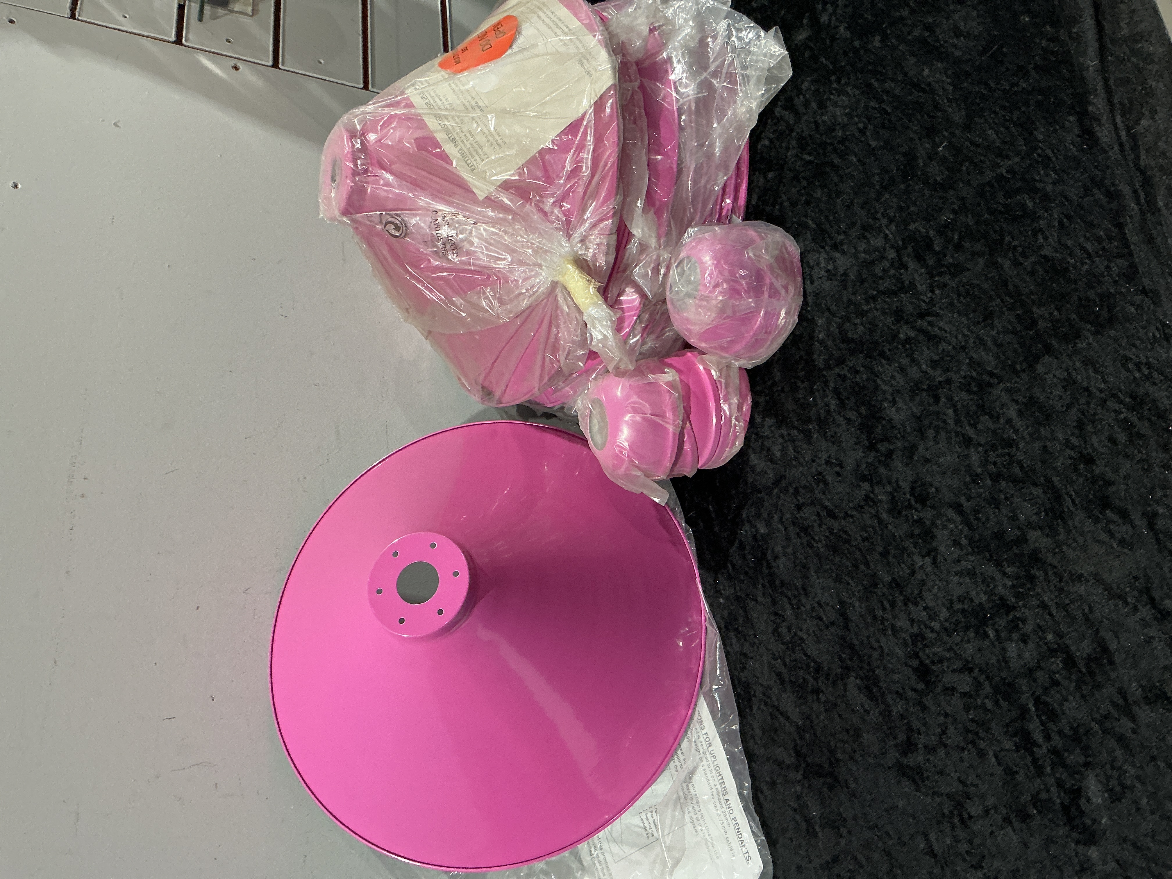 A collection of 12 new old stock lighting components constructed from spun metal and finished in a high-gloss hot pink enamel. The lot includes large, wide conical shades and smaller dome-shaped fixture caps or covers. Several components remain sealed in their original protective plastic wrapping. Visible manufacturer documentation confirms these fittings are intended for use as “UPLIGHTERS AND PENDANTS.” One component stack retains an orange warning sticker marked “DO NOT OPEN.”