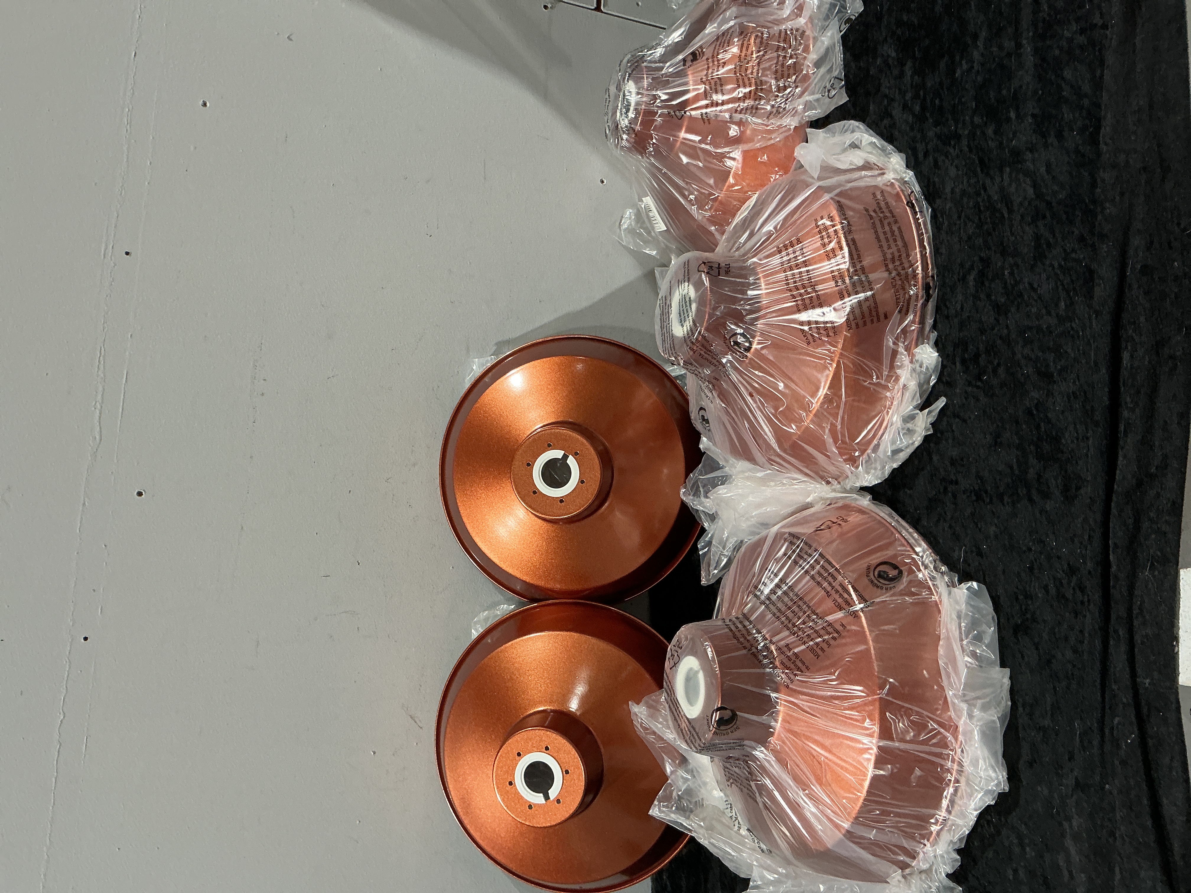 A collection of eight metallic reflector shades or housing components intended for industrial or modern lighting fixtures. These items are constructed of metal and finished in a bright, shimmering metallic copper or orange powder coating. The components feature a conical or bell-shaped profile. The two unwrapped examples clearly display a centralized mounting structure at the apex, which includes a keyway slot and six equidistant fastener holes designed for fixture attachment. Several components are individually enclosed in clear plastic packaging printed with multi-lingual safety warnings, including English, French, and Spanish text, and bear the visible *Der Grüne Punkt* (The Green Dot) recycling scheme markings, suggesting contemporary manufacture.