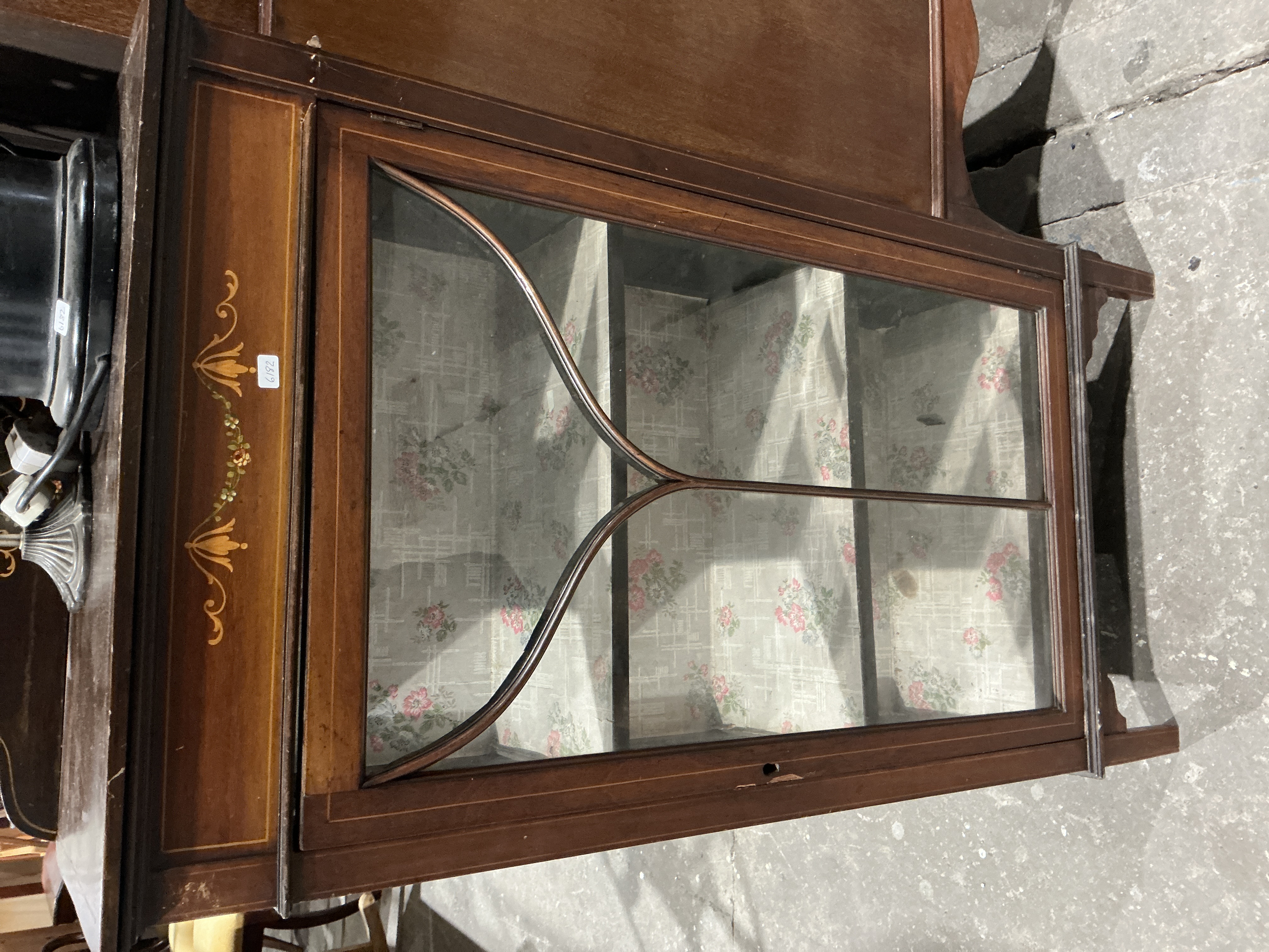 A narrow Edwardian display cabinet constructed of dark stained wood veneer, likely mahogany, featuring lighter wood inlay used for strip banding and decorative accents. The upper frieze panel is adorned with a painted or inlaid floral swag decoration. The front is fitted with a single glazed door defined by a distinctive stylized vertical muntin, creating an arched or heart-like division. The interior contains three fixed shelves. The back of the case is lined with a highly patterned, light-colored fabric or wallpaper featuring pink and green floral clusters over a faint grid design. A small white inventory label marked ‘6182’ is affixed to the upper frieze panel.
