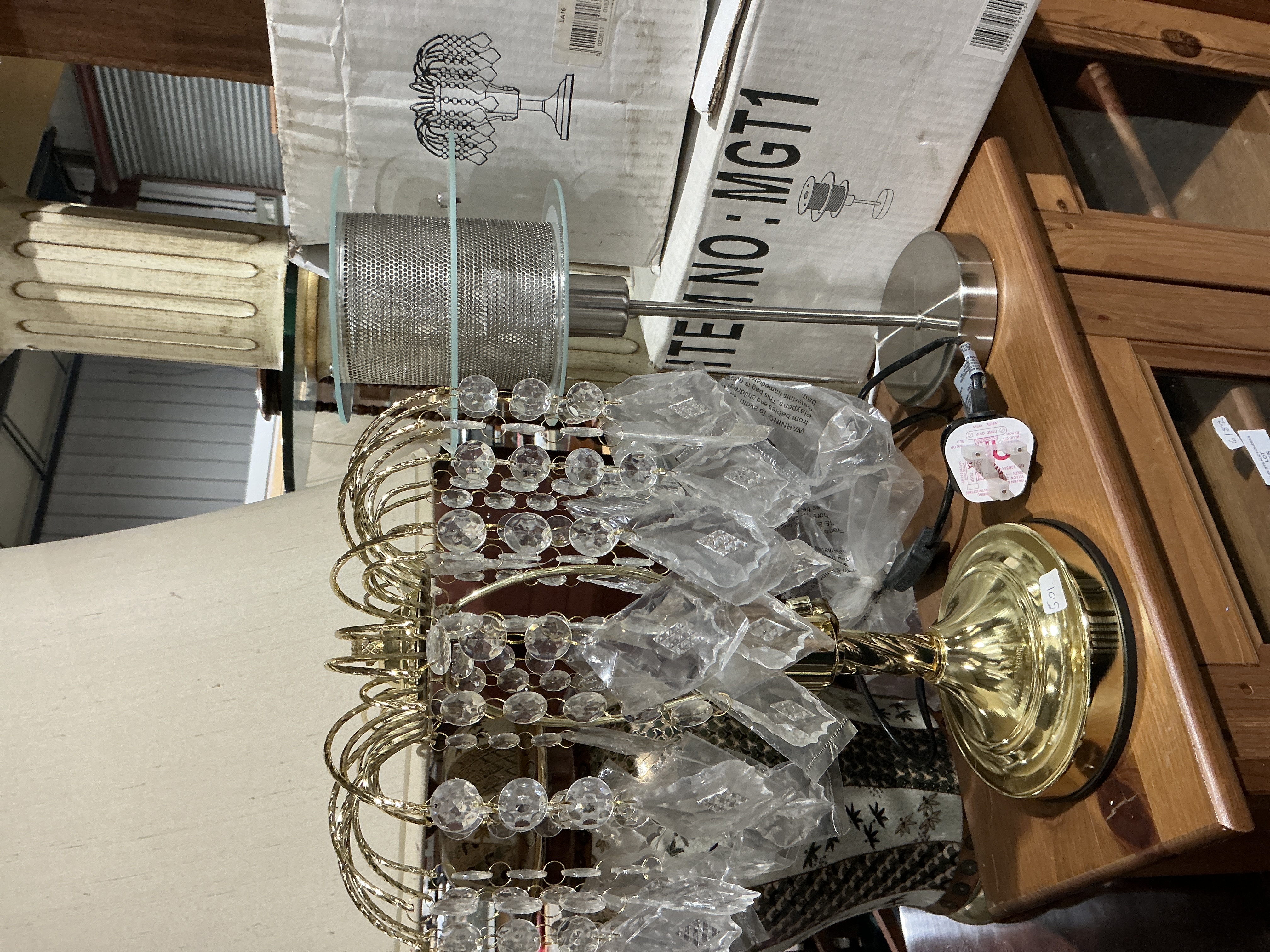 A collection of two contemporary electric table lamps offered together with associated packaging. The first lamp is of a chandelier or waterfall design, featuring a polished gold-tone metal base and twisted column supporting a canopy frame from which numerous faceted clear drops, likely acrylic or glass crystal, are suspended. The second lamp is of a modern cylindrical form, constructed of silver-tone brushed metal with a perforated mesh shade section, separated by two clear circular glass tiers. Both lamps are electric. A large white cardboard shipping box marked ITEM NO: MGT1 is visible in the background, suggesting the context of new lighting stock. The gold-tone lamp is fitted with a UK/Commonwealth standard plug marked 3A FUSE.