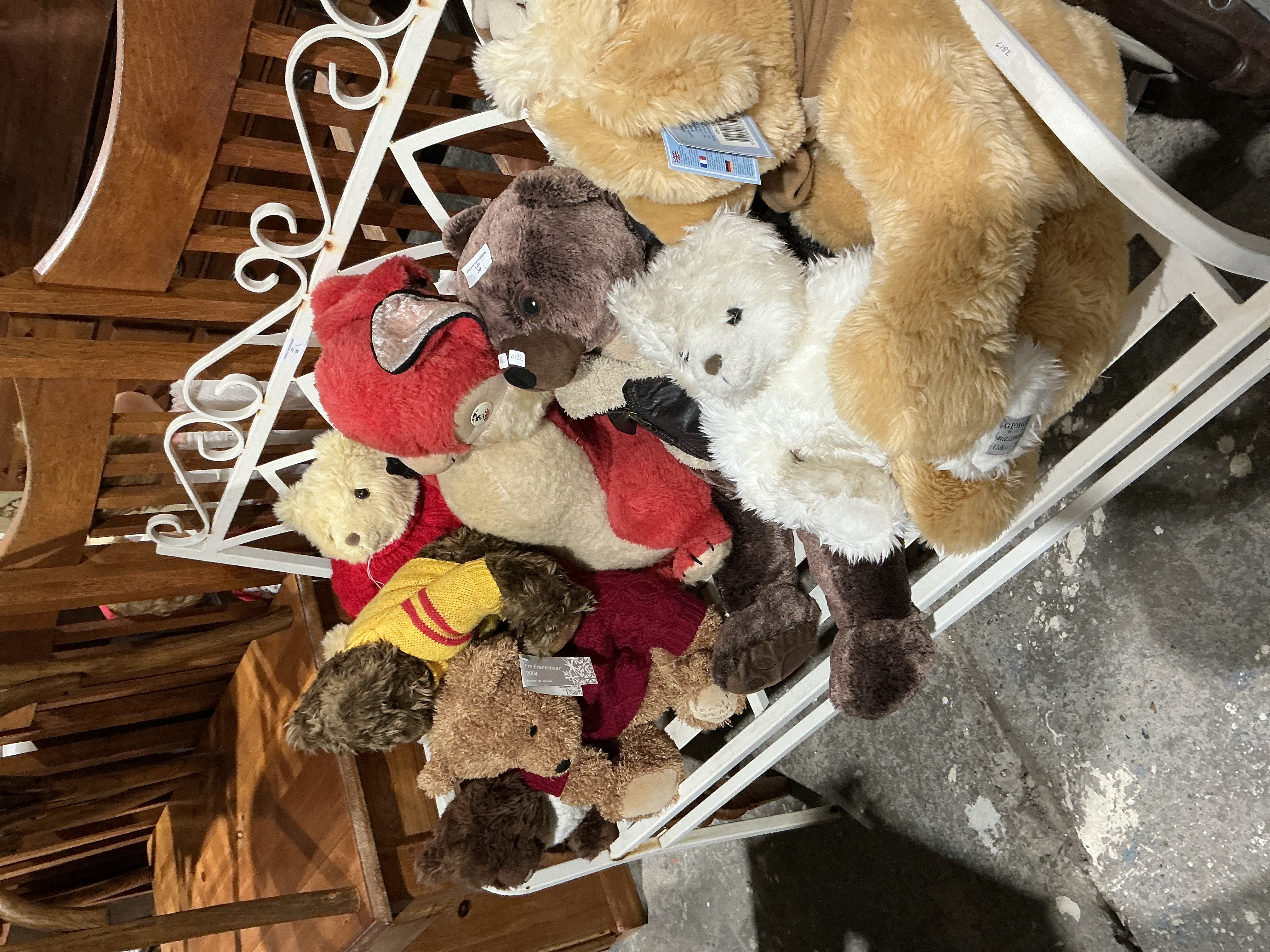 A Collection of Nine Assorted Contemporary Plush Teddy Bears and Stuffed Animals on a Metal Bench