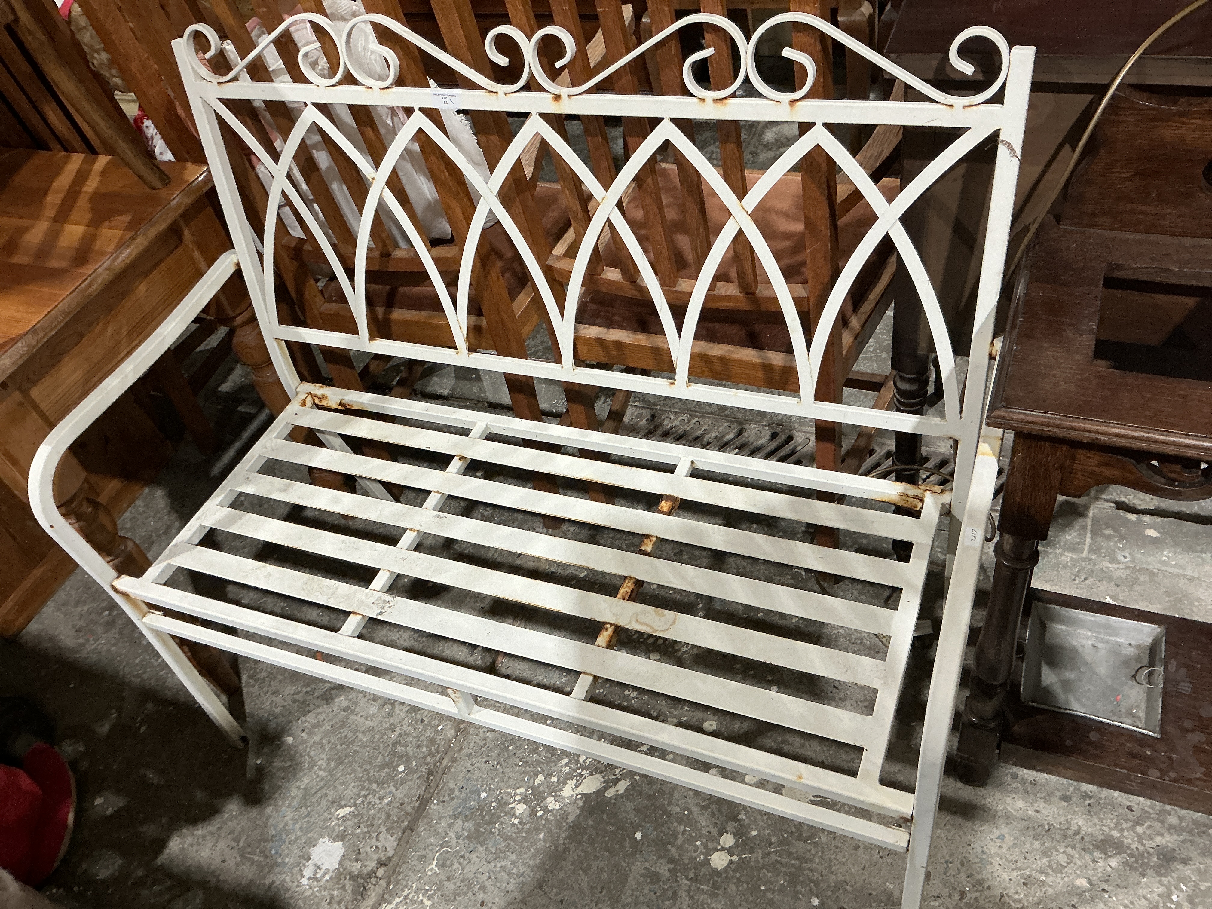 A single metal garden bench constructed from tubular steel or wrought iron, finished in distressed white paint. The design is consistent with contemporary outdoor furniture that emulates Victorian or Gothic Revival park benches. The backrest features a repeating pattern of stylized pointed arch openings reminiscent of Gothic tracery, topped by scrolling volute accents along the upper rail. The seat is formed by parallel horizontal metal slats. An auction label marked “LOT 58” is visible on the backrest.