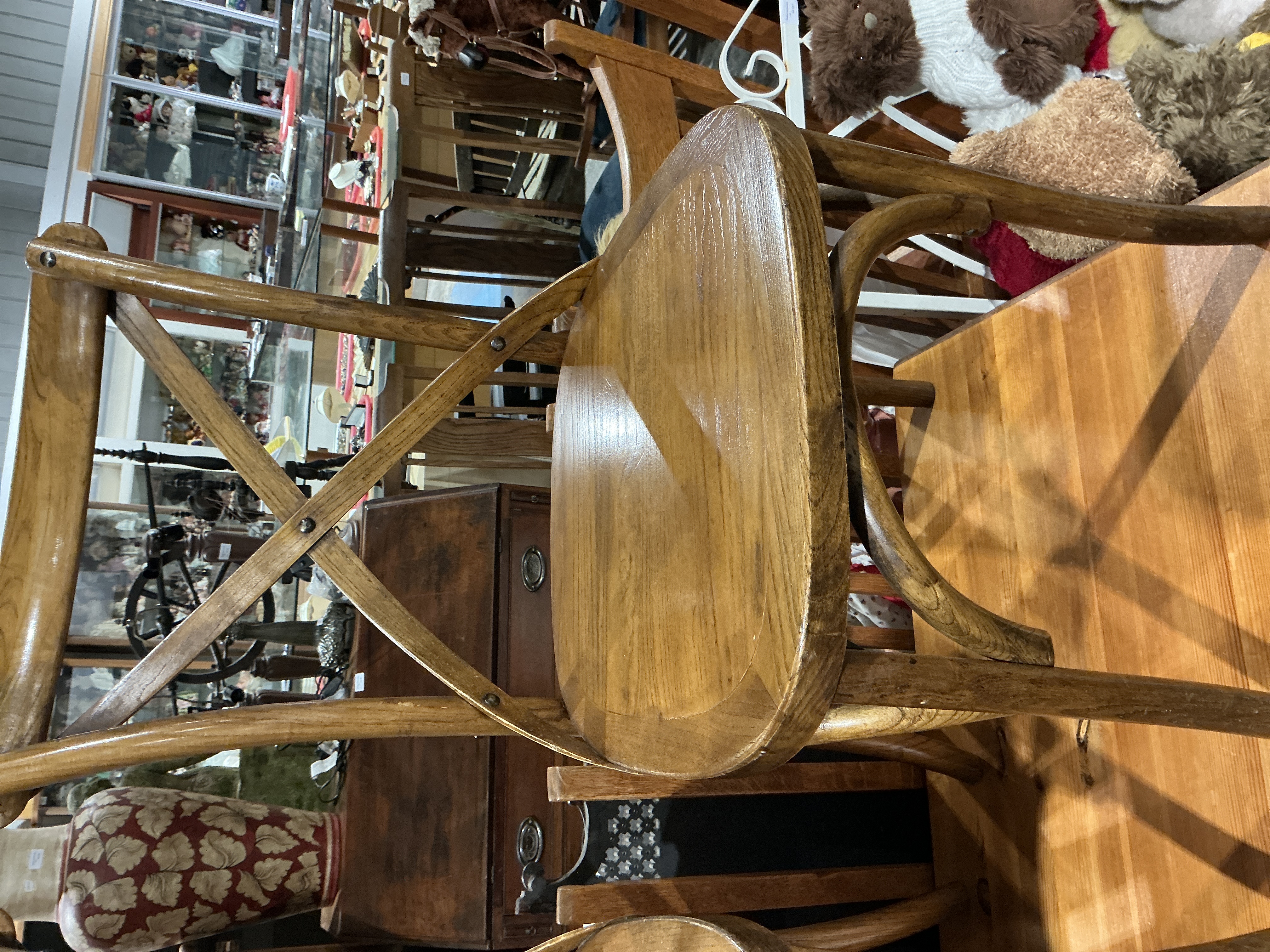 A pair of dining chairs executed in the bentwood style, commonly associated with bistro or farmhouse designs. Each chair is constructed of solid wood exhibiting a medium-to-honey-brown color with a glossy, reflective finish. The design features a contoured, solid wood saddle seat and an X-back (cross-back) backrest. The backrest is formed by two bent vertical uprights supporting two crossed horizontal slats secured by visible metal hardware at the intersection and attachment points. The legs and stretchers display typical bentwood curvature. The chairs bear no discernible maker’s marks or labels.