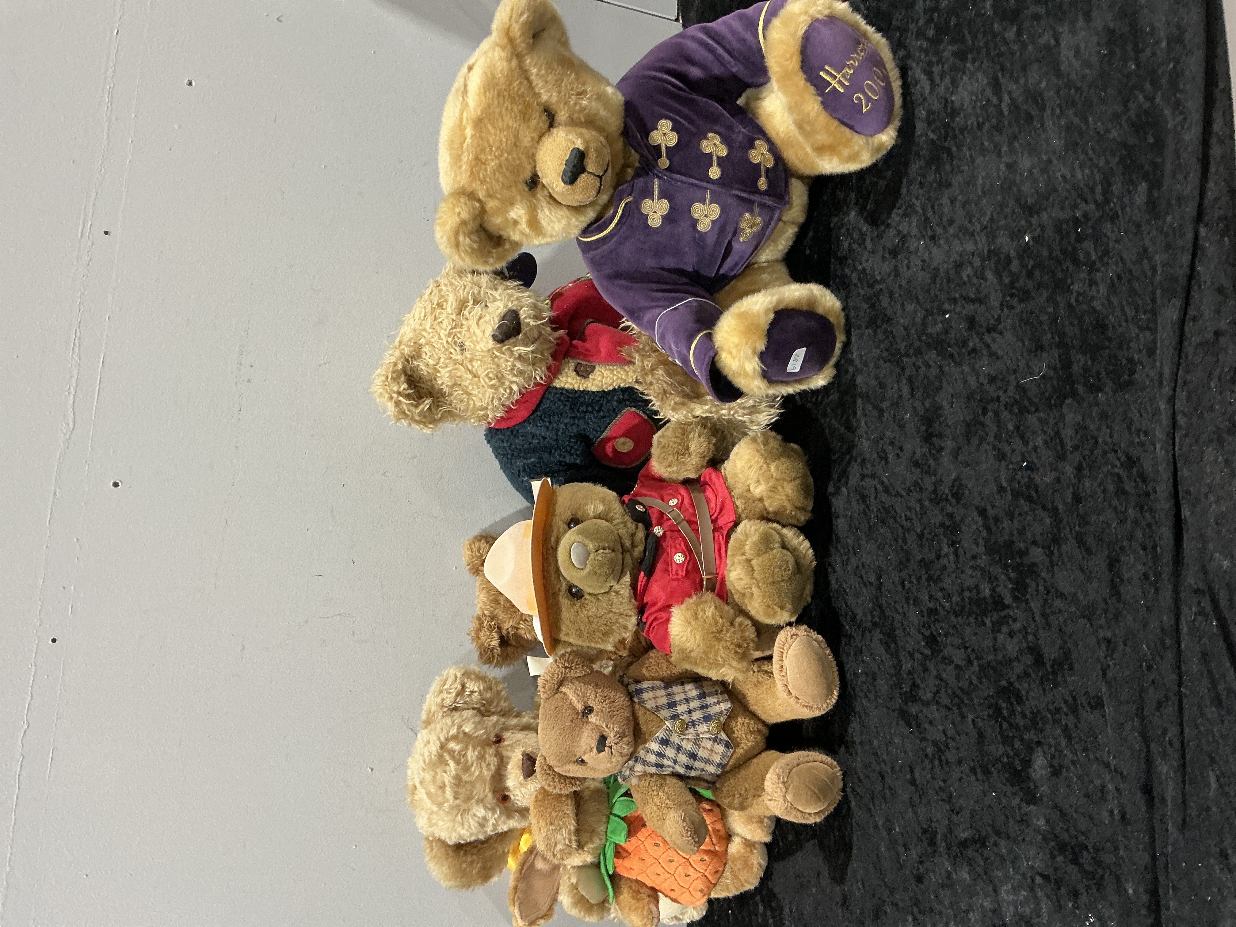 A collection of seven collectible stuffed plush toys, predominantly comprising teddy bears and one rabbit figure, constructed from various shades of synthetic faux fur and textile materials. The items are identified through web consensus and specific markings as part of the Harrods collectible line, known for their annual Christmas and themed bears. The collection includes five distinct costumed figures: a rabbit wearing an orange carrot outfit, a bear dressed in a brown plaid vest, a bear in a red uniform with a campaign hat resembling an RCMP style, a bear wearing a dark knit sweater and red scarf, and a large bear donning a purple velvet jacket adorned with gold coiled embroidery. The large bear in the purple jacket features gold embroidery on its foot pad reading Harrods 2000, indicating a specific collection year.
