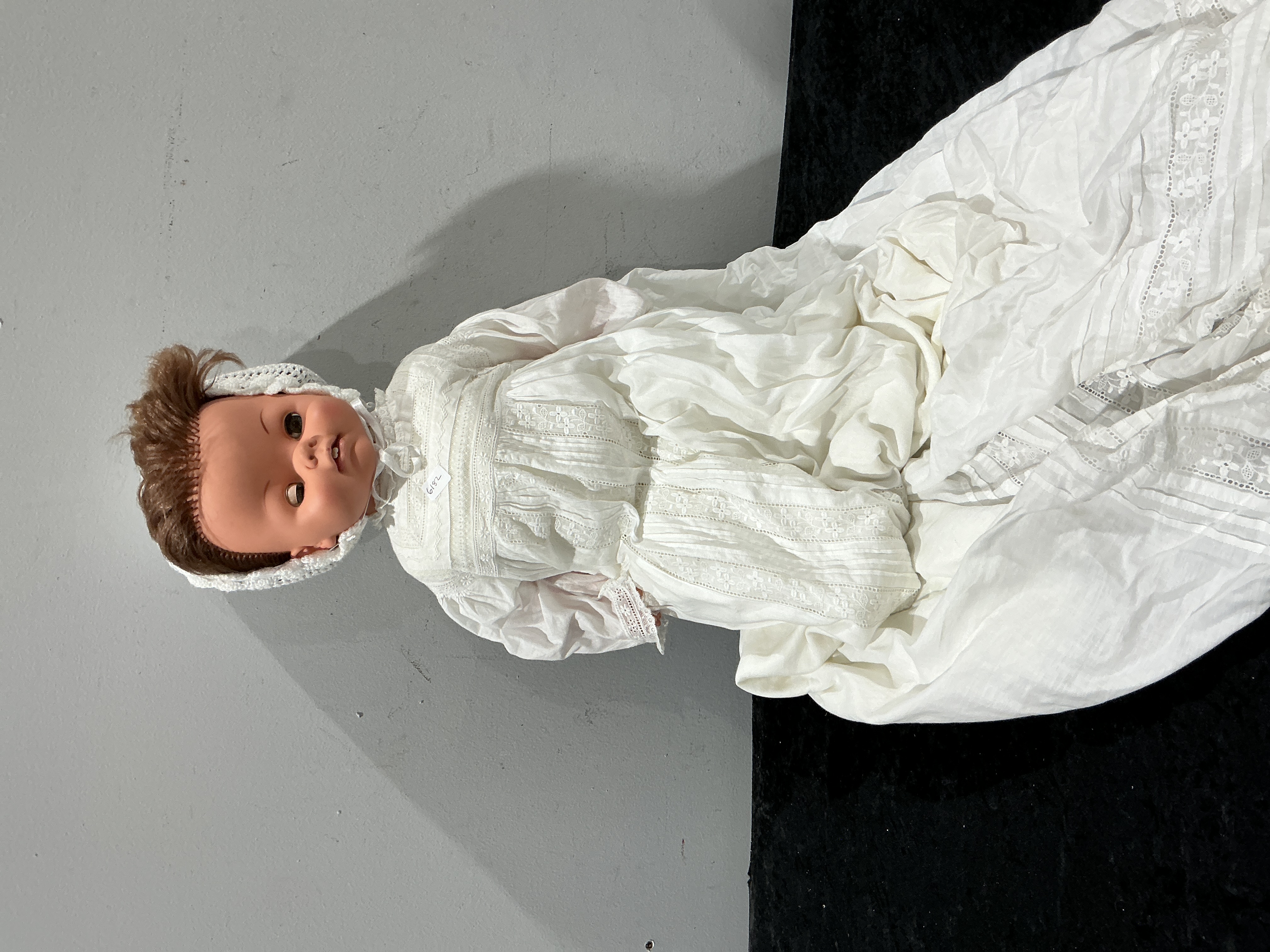 A single vintage doll identified through market consensus as the Franklin Mint Heirloom Doll Victorian Christening Doll, often associated with the 1986 production year. The figure is a baby or toddler doll, constructed of plastic or vinyl with a molded face and rooted brown hair. The doll is attired in an ornate, traditional white christening gown or long dress and a matching crocheted or knitted bonnet. The extensive white textile garment features detailed construction including pintucks, lace insertion, and floral eyelet embroidery, extending into a long skirt train spread out below the figure. A small, white diamond-shaped inventory tag bearing the numbers 6182 is pinned or attached to the chest of the gown.