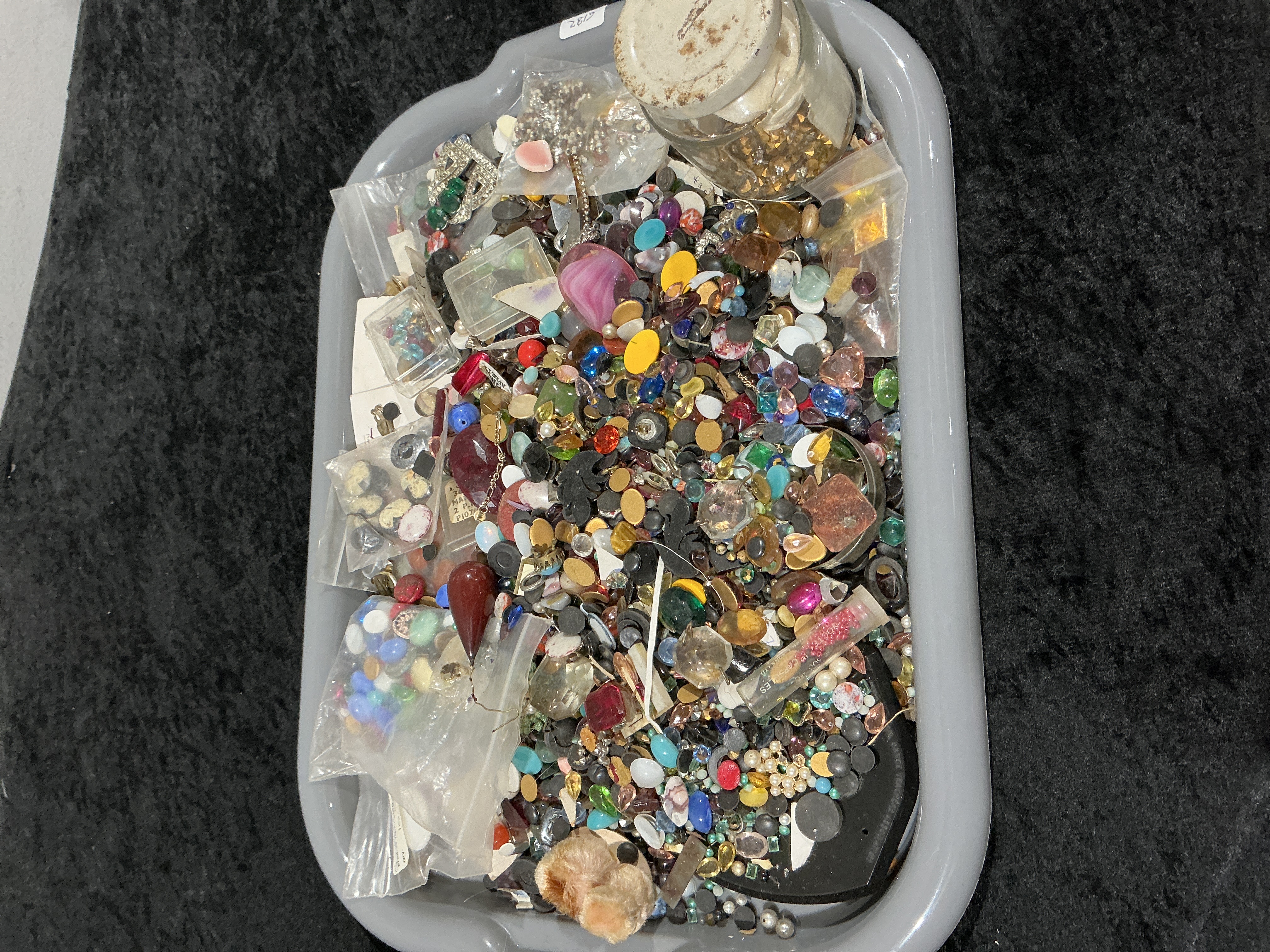 A substantial collection of loose jewelry components, scrap material, and craft findings contained within a gray plastic utility tray. The lot is characterized by its mixed nature, incorporating both vintage and modern materials suitable for salvage, repair, or crafting projects. The bulk material consists of thousands of loose pieces, including faceted glass rhinestones, opaque plastic and resin cabochons, various types of beads such as faux pearls, and miscellaneous metal findings, presented in a wide array of colors, shapes, and sizes. The lot also includes ten distinct packaged groupings: seven small resealable plastic bags containing various beads and stones, one small clear plastic tub, one slender plastic vial containing small pink or red beads, and one glass jar with a worn white lid containing golden flaked material. A small sticker bearing the handwritten number 2812 is affixed to the exterior side of the tray.