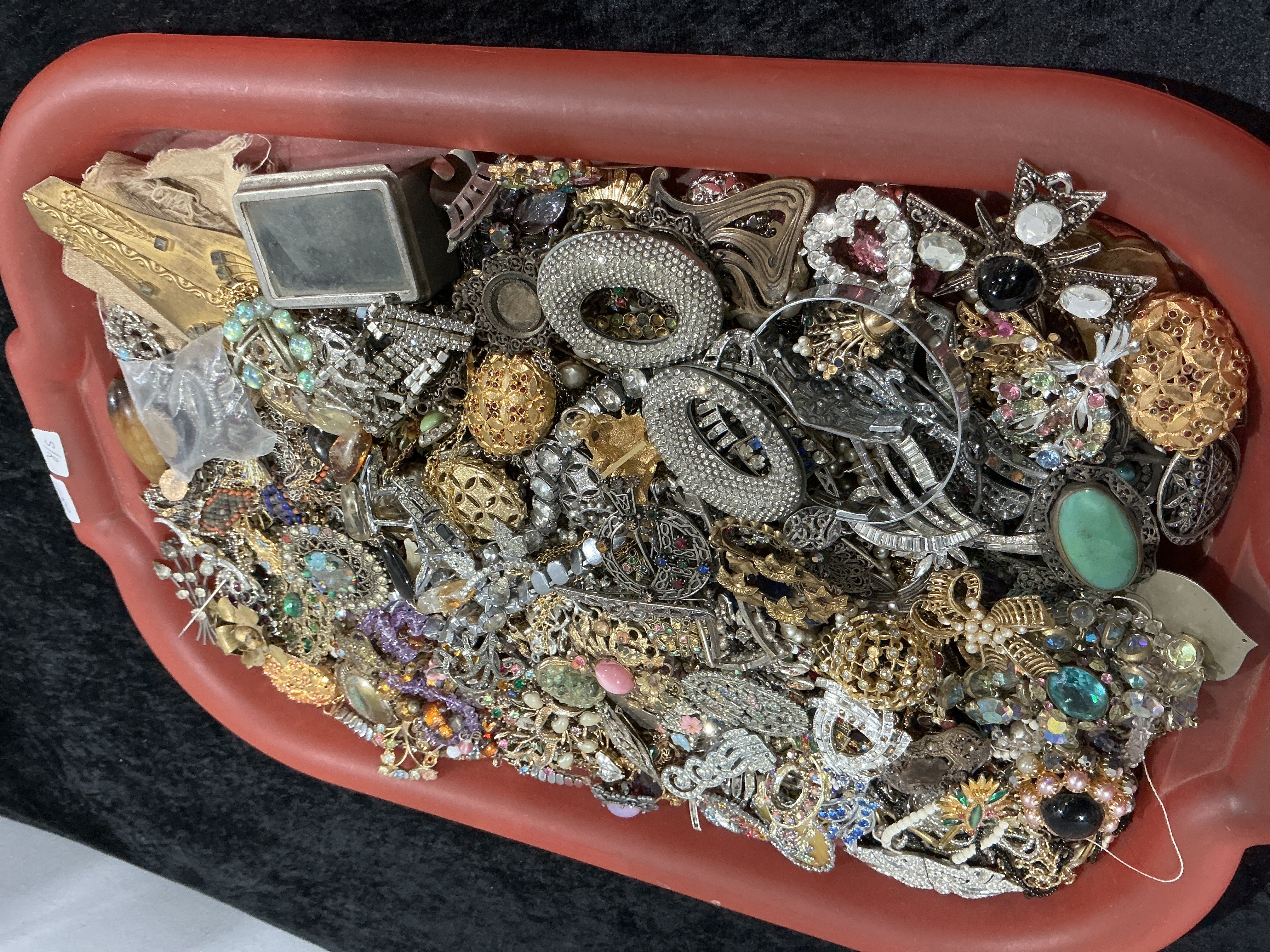 An extensive, unsorted collection of vintage and contemporary costume jewellery ware presented in a red plastic handling tray. This large quantity is intended for spares or repairs, craft, or harvest. The assemblage includes numerous brooches, pendants, chains, bracelets, and earring components, constructed primarily from mixed base metals with gold- and silver-toned finishes. Items are set with a variety of simulated stones, including clear and colored rhinestones (chaton and baguette cuts), simulated pearls, and glass or plastic cabochons in hues such as faux turquoise and black onyx. Styles are eclectic, spanning mid-20th century to modern periods, featuring figural, floral, pavé, and openwork designs. Also visible within the lot are a small silver-toned square box/locket and a long, engraved brass-toned component. The lot is sold as a single unit.