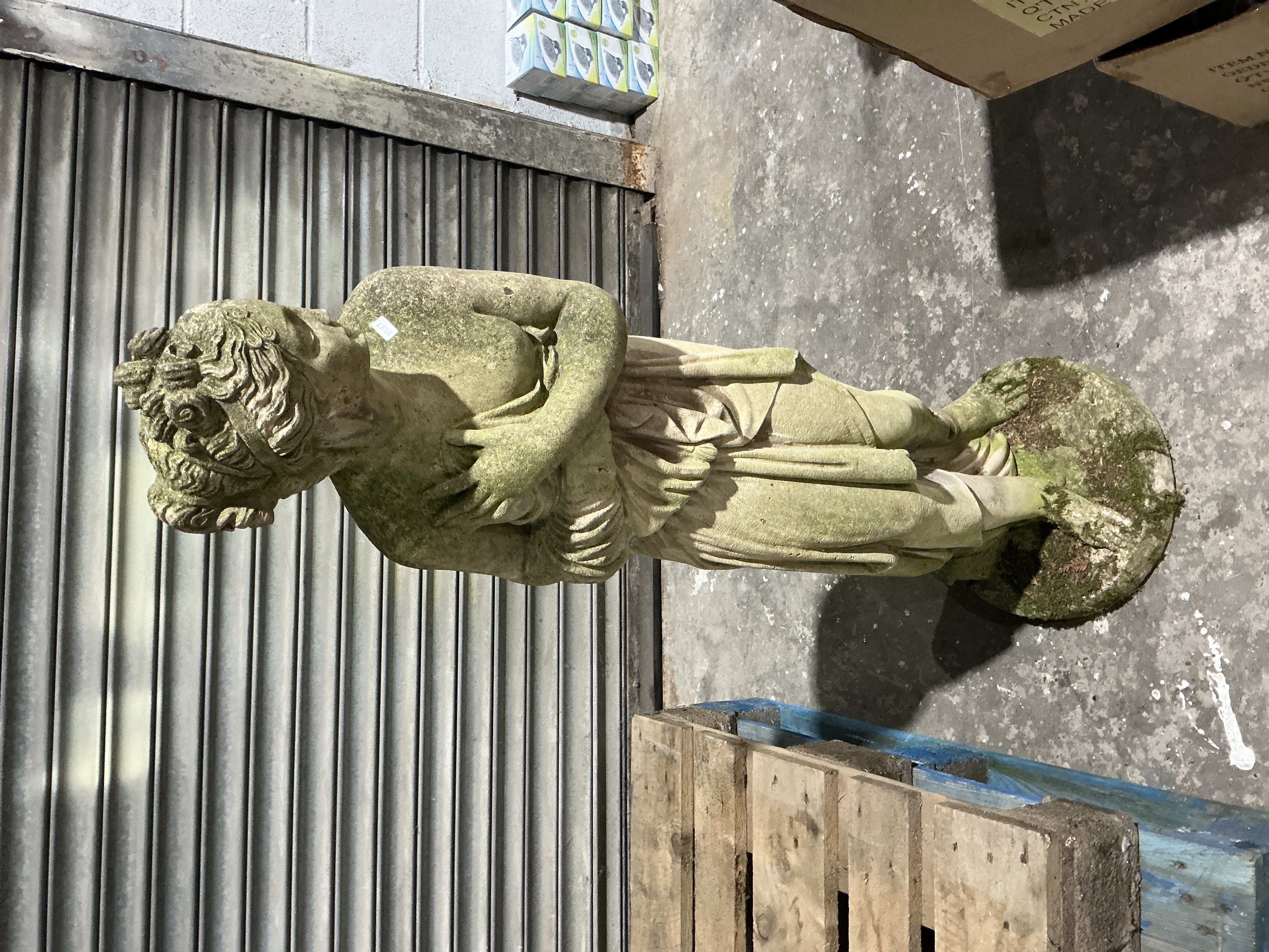 A full-length garden statue constructed from cast stone or concrete, depicting a classical style female figure. The figure is shown standing on a circular base, draped in thin classical garments, with her arms crossed over her chest. Her hair is styled intricately. The statue bears a small white rectangular inventory sticker with the number 8497 visible on the upper right shoulder area.