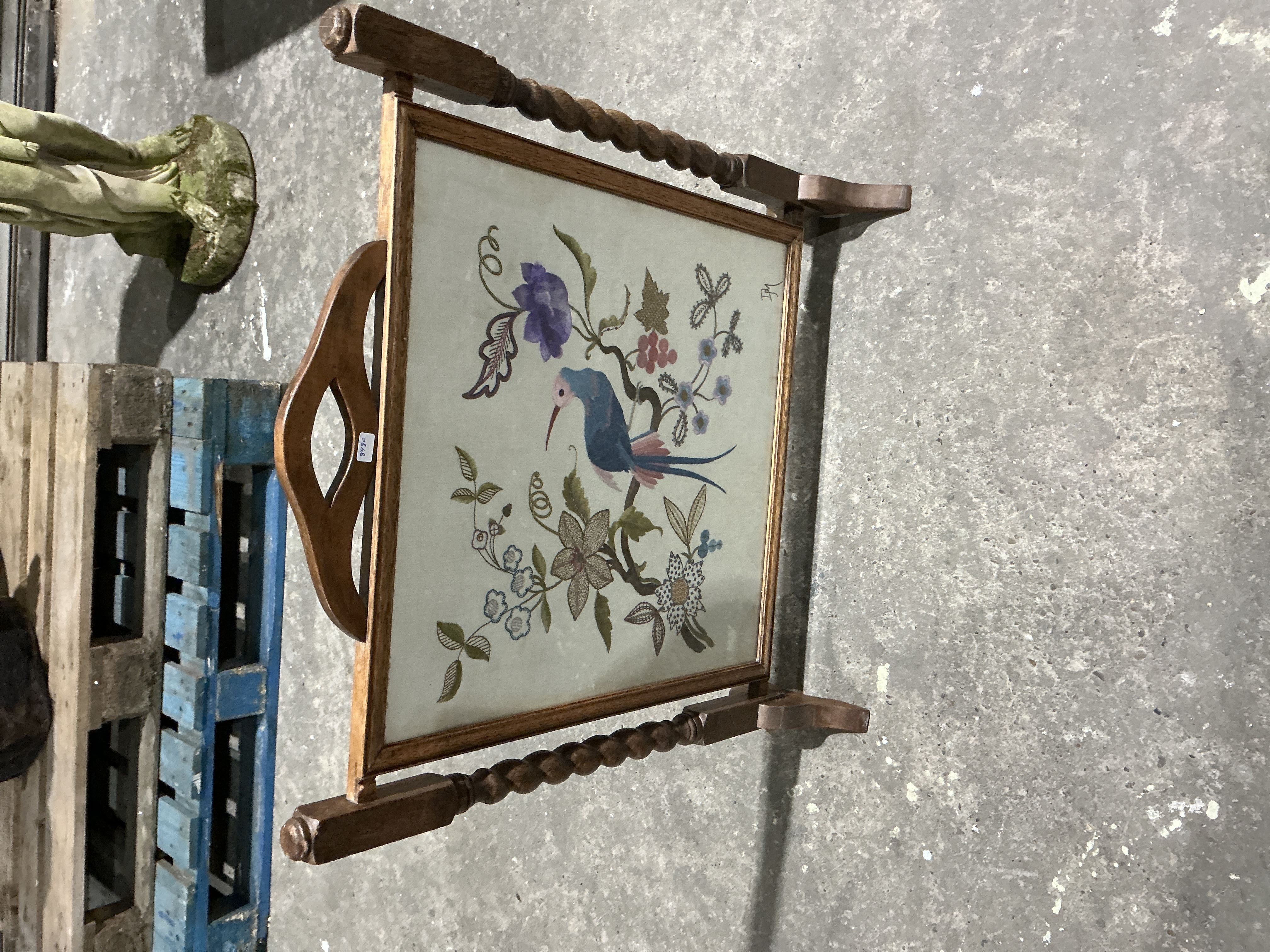 A single, free-standing antique firescreen constructed of dark-stained hardwood, likely dating to the late Victorian or Edwardian revival period. The structure features vertical posts carved with distinctive barley twist detailing, supported by shaped feet. The upper rail incorporates a stylized, carved cutout handle. The central rectangular panel holds a textile insert framed in a lighter-toned wood, possibly oak. The textile is decorated with colorful embroidery or needlepoint depicting a stylized blue and pink bird perched among various floral and vine motifs. Visible markings include script initials, potentially “TM” or “JH,” located in the lower right corner of the embroidery, and a small white inventory sticker marked “89.90” affixed to the top wooden rail.
