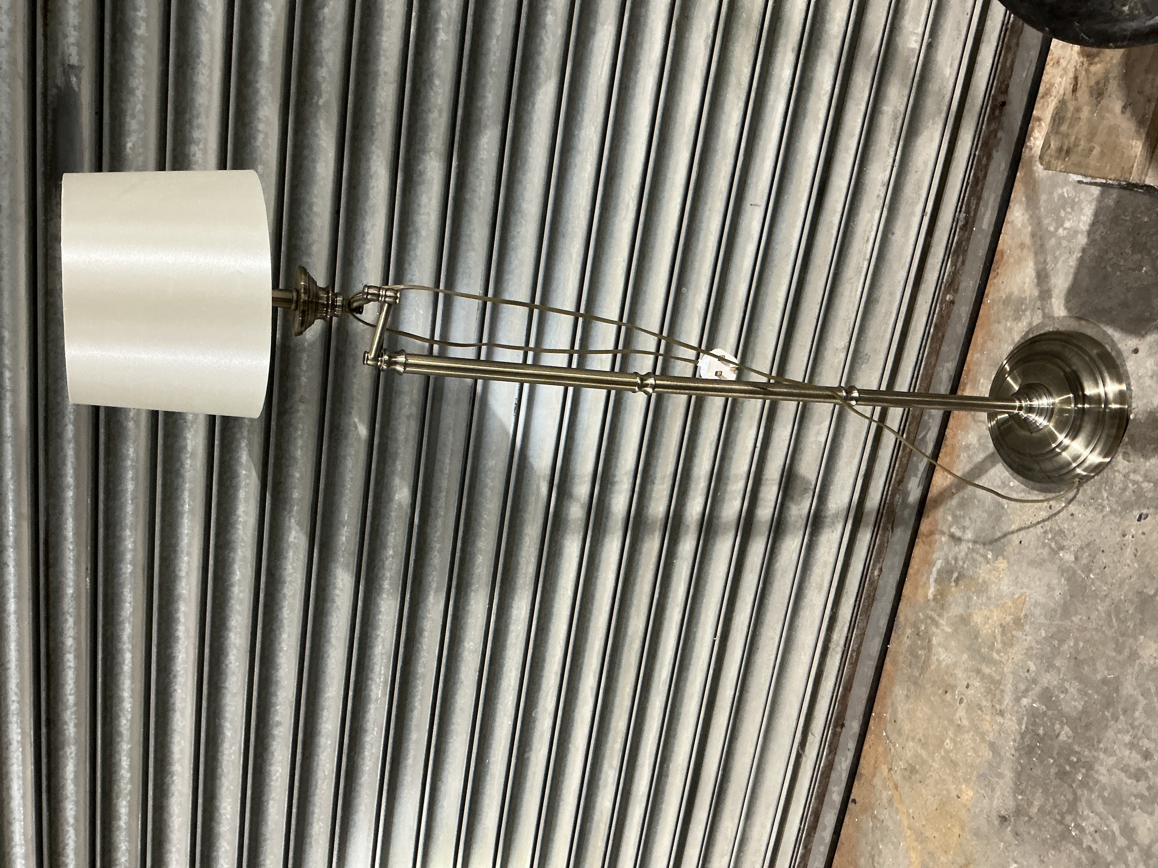 A single transitional style adjustable floor lamp. The lamp features a swing arm mechanism and an adjustable height column constructed of brushed metal with an antique brass-tone finish. It rests on a stepped, circular base. The lamp is topped with a cylindrical drum shade fabricated from a creamy white or ivory textile. Electrical components include a tan power cord fitted with a white in-line switch. The design is characteristic of modern production floor lamps intended for reading or task lighting.