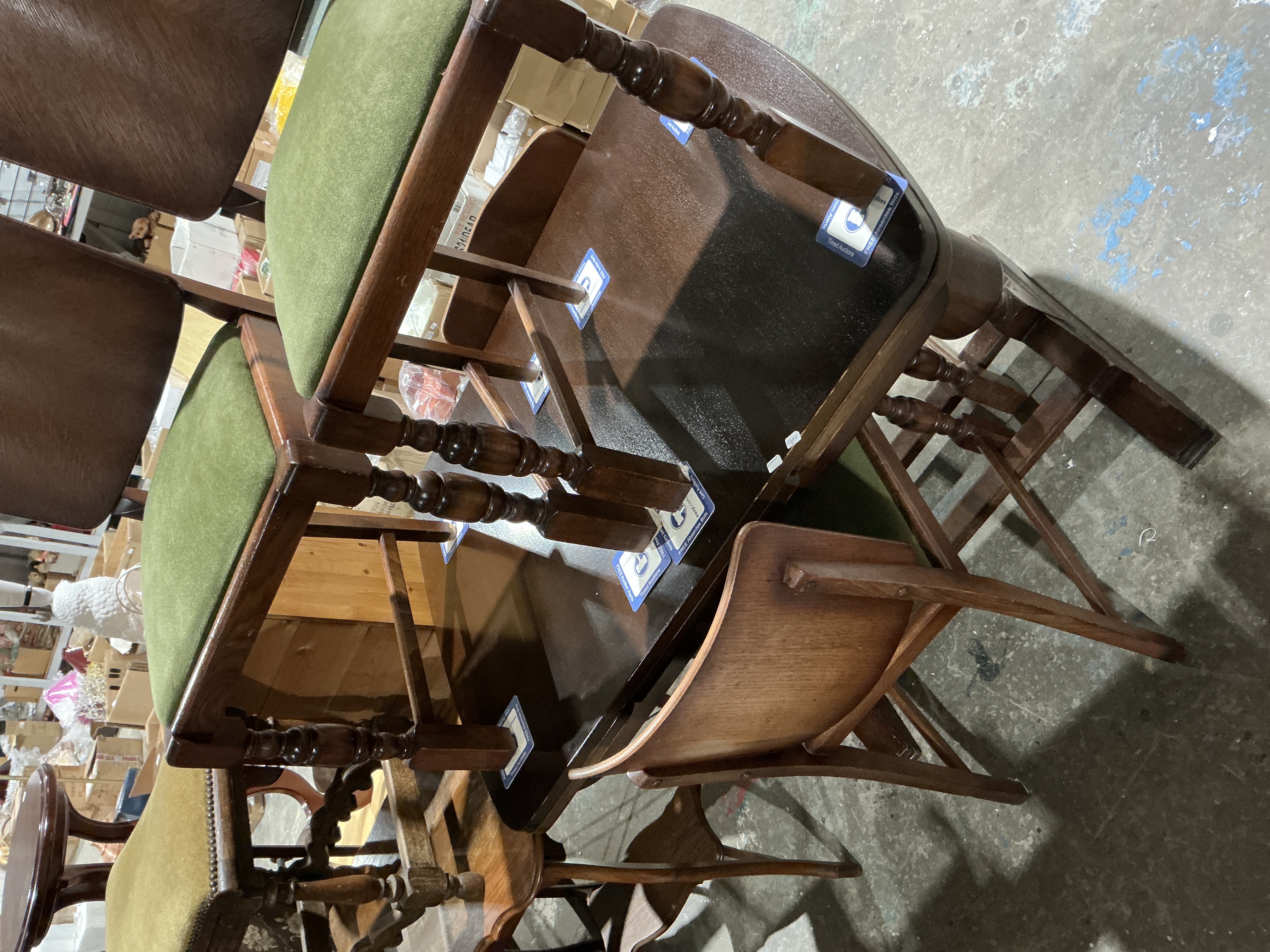 A collection of five pieces of vintage beautility furniture, consistent with the style and period associated with Beautility furniture, likely dating to the Mid-Century period. The collection comprises four seating items and table. The seating includes four of matching high-back chairs featuring dark reddish-brown wood, heavily turned front legs, and bright green upholstered seats. upholstery secured by nailhead trim. The chairs are constructed of wood, possibly walnut as suggested by comparable market examples.