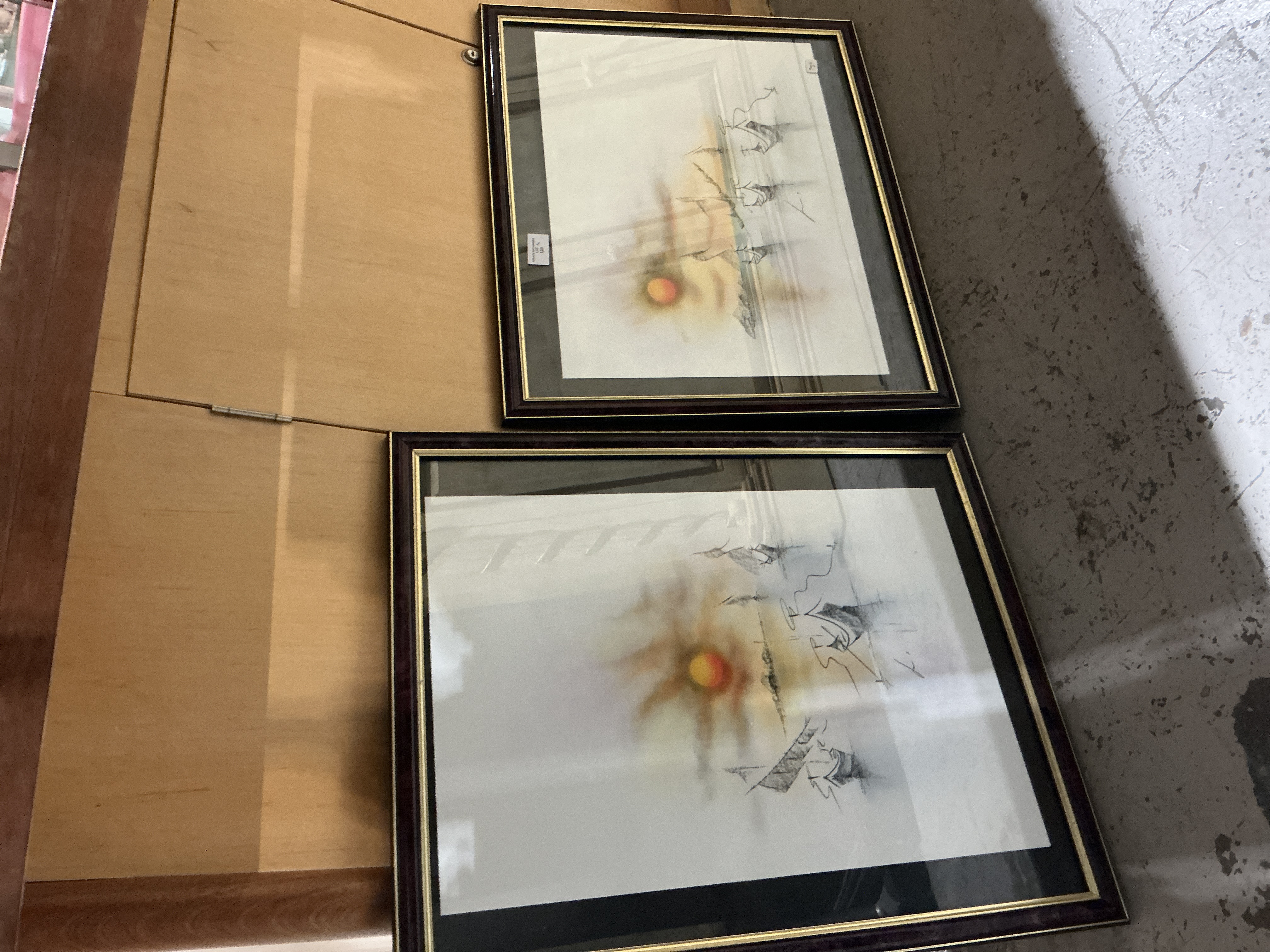 A pair of contemporary framed artworks depicting minimalist seascape scenes. Each piece features several small boats silhouetted against a brightly colored, hazy sun element, suggesting a sunrise or sunset. The technique utilizes fine ink or sketch lines combined with diffused color application, likely watercolor or mixed media on paper. The artworks are presented under glass in matching dark wood frames, each fitted with a gold-toned inner filet and dark matting. A small stylized signature is visible in the lower central area of the image on both pieces. The items are presented as a matching set, though they differ in orientation and size: one is vertical (portrait) and the other is horizontal (landscape). The smaller frame bears an auction inventory sticker labeled “LOT # 223” visible under the glass.