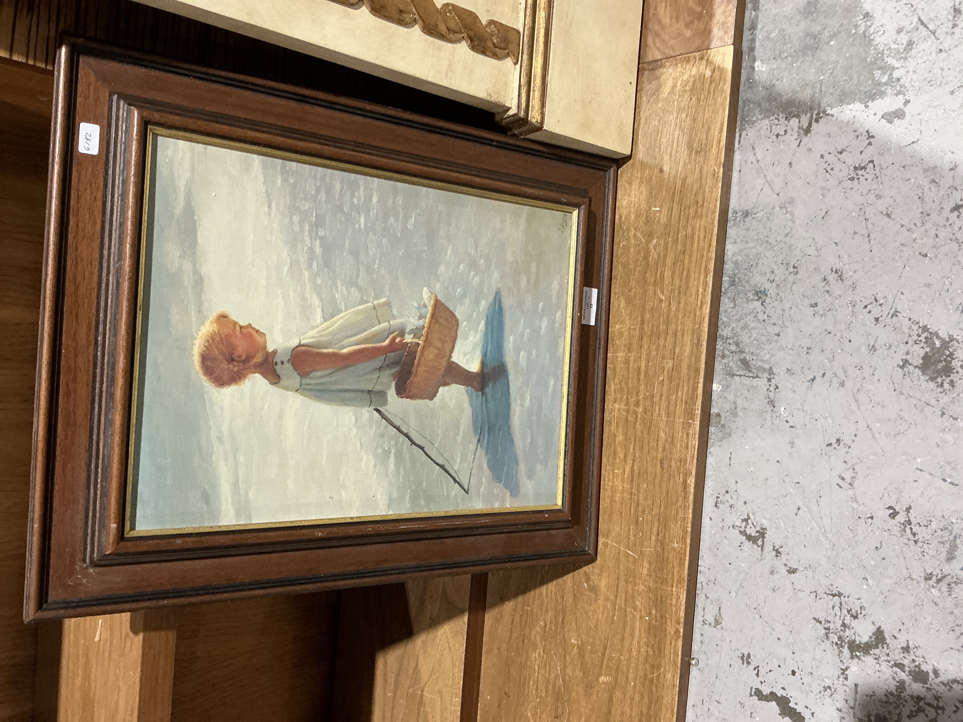 A framed reproduction print titled Young Girl on a Beach attributed to the artist I. Davidi. This single artwork depicts a young blonde child, likely a girl, standing barefoot in shallow water on a beach, holding a woven basket and a slender stick. The print is housed within a rectangular dark brown wooden frame featuring a molded profile and a thin gold-toned interior border (slip). Visible markings include a white sticker on the upper right corner of the frame reading 6182, and a small auction sticker on the bottom border reading SHELBY’S AUCTIONEERS / LOT / 19.