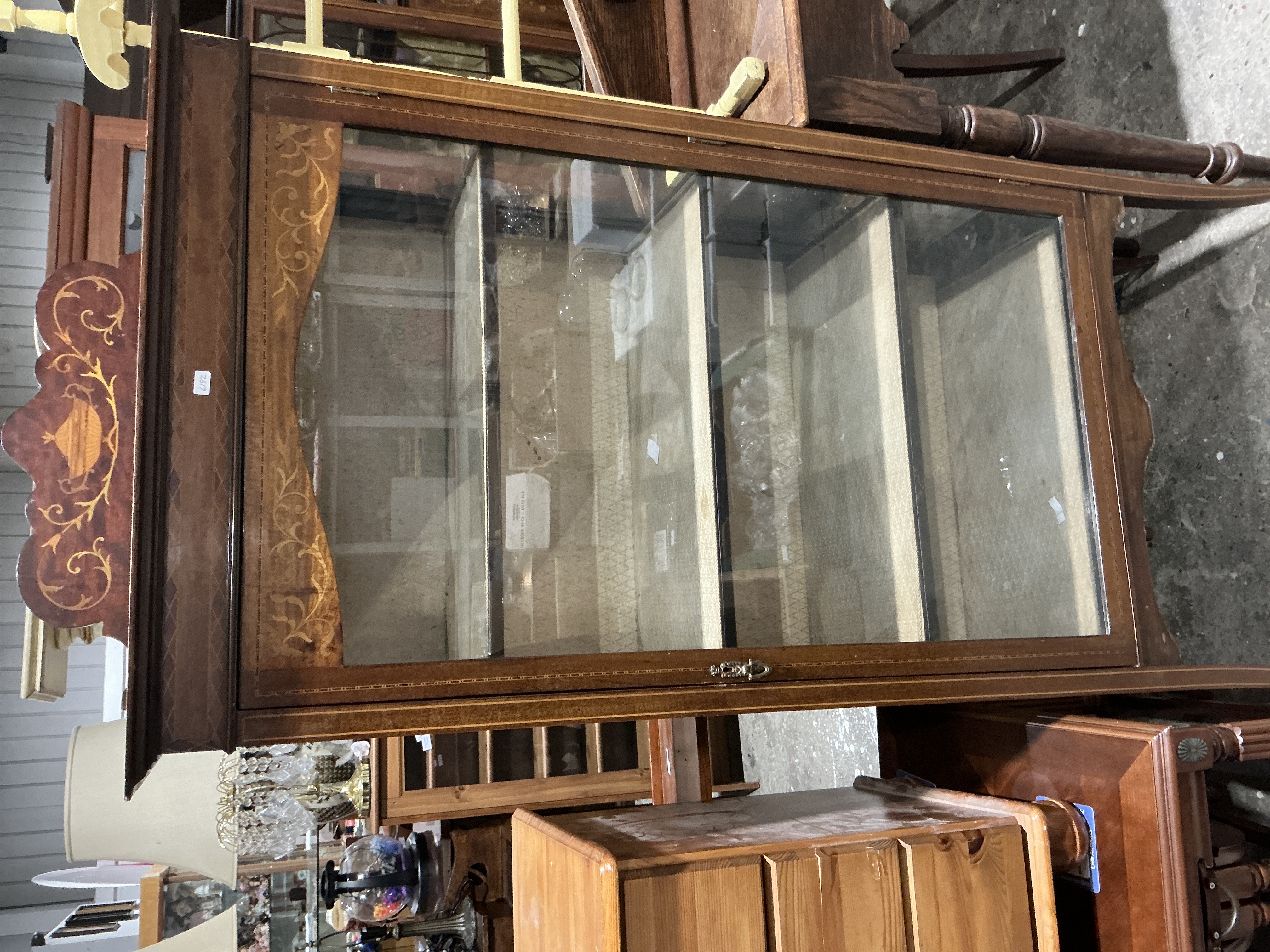 Antique Victorian Tiger Oak Single Door Display Cabinet with Marquetry Pediment
