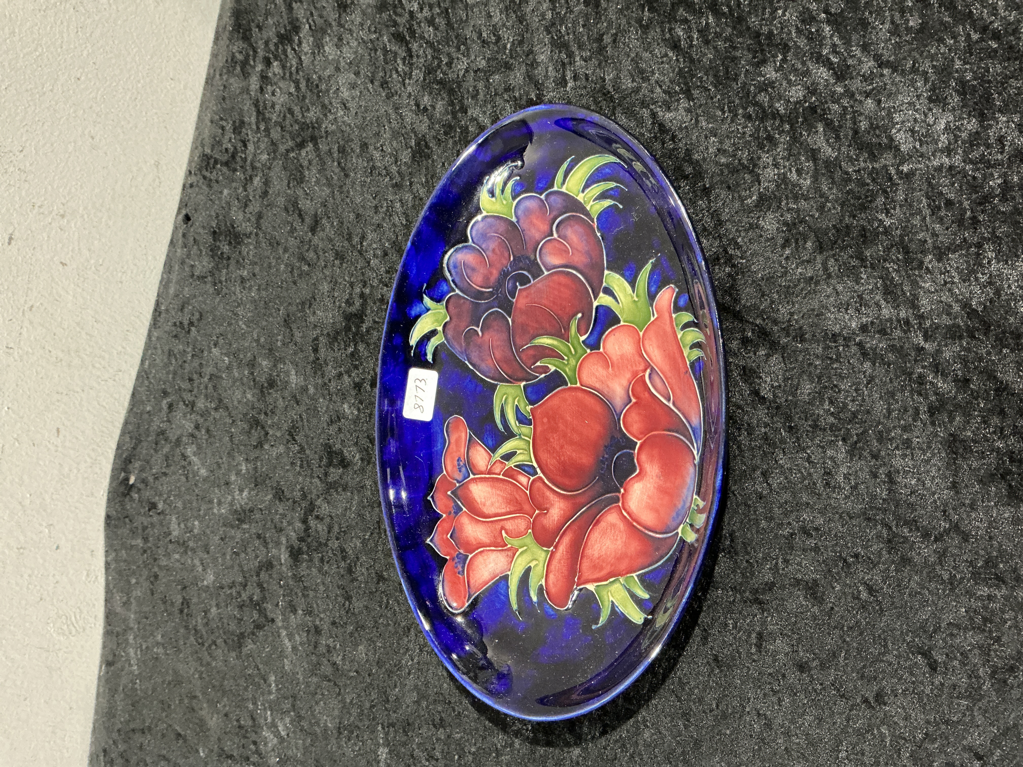 A single oval ceramic dish manufactured by Moorcroft Pottery, decorated in the popular Anemone pattern. The earthenware body is covered in a deep, mottled cobalt blue ground glaze. The decoration features large, stylized anemone flowers in shades of deep red, burgundy, and purple, accented by green foliage, all executed using the tube-lining technique. The piece has a highly reflective, glossy finish. The underside features a cream-colored recessed center bearing the impressed or stamped marks MOORCROFT, MADE IN, and ENGLAND. An applied rectangular white sticker marked 3773 is present on the top surface.