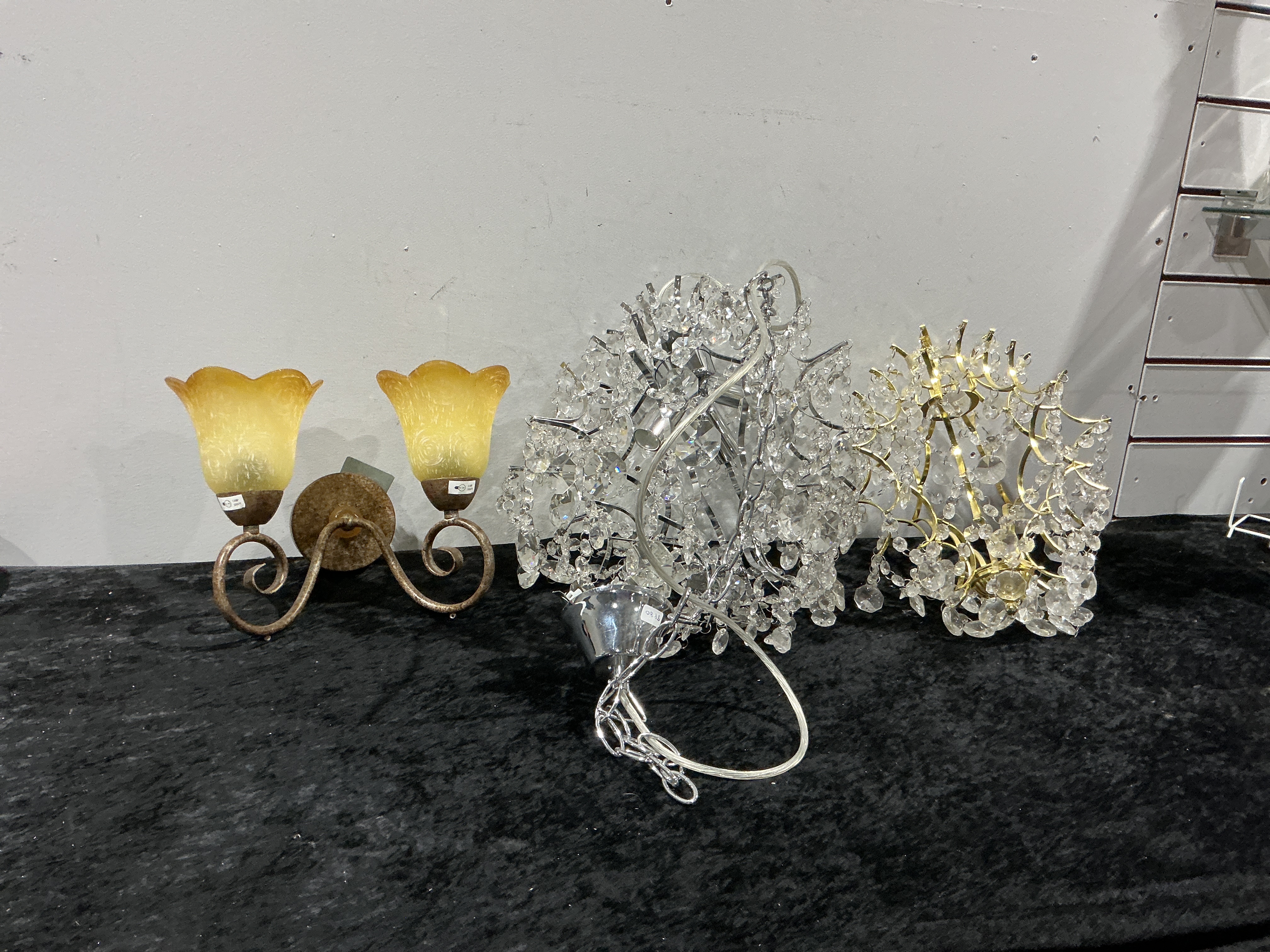 A collection of three mixed lighting fixtures. The lot includes one double-arm wall sconce constructed of distressed bronze-toned metal featuring scrolling elements, fitted with two amber/yellow mottled tulip-shaped glass shades. A sticker reading LAMP SHADE is visible on one shade holder. The lot also includes two modern cluster-style chandeliers or pendant lights. One chandelier features a bright silver-toned metal frame adorned with numerous clear faceted crystal or acrylic drops. The second chandelier features a gold or brass-toned metal frame similarly decorated with clear faceted crystal or acrylic drops.