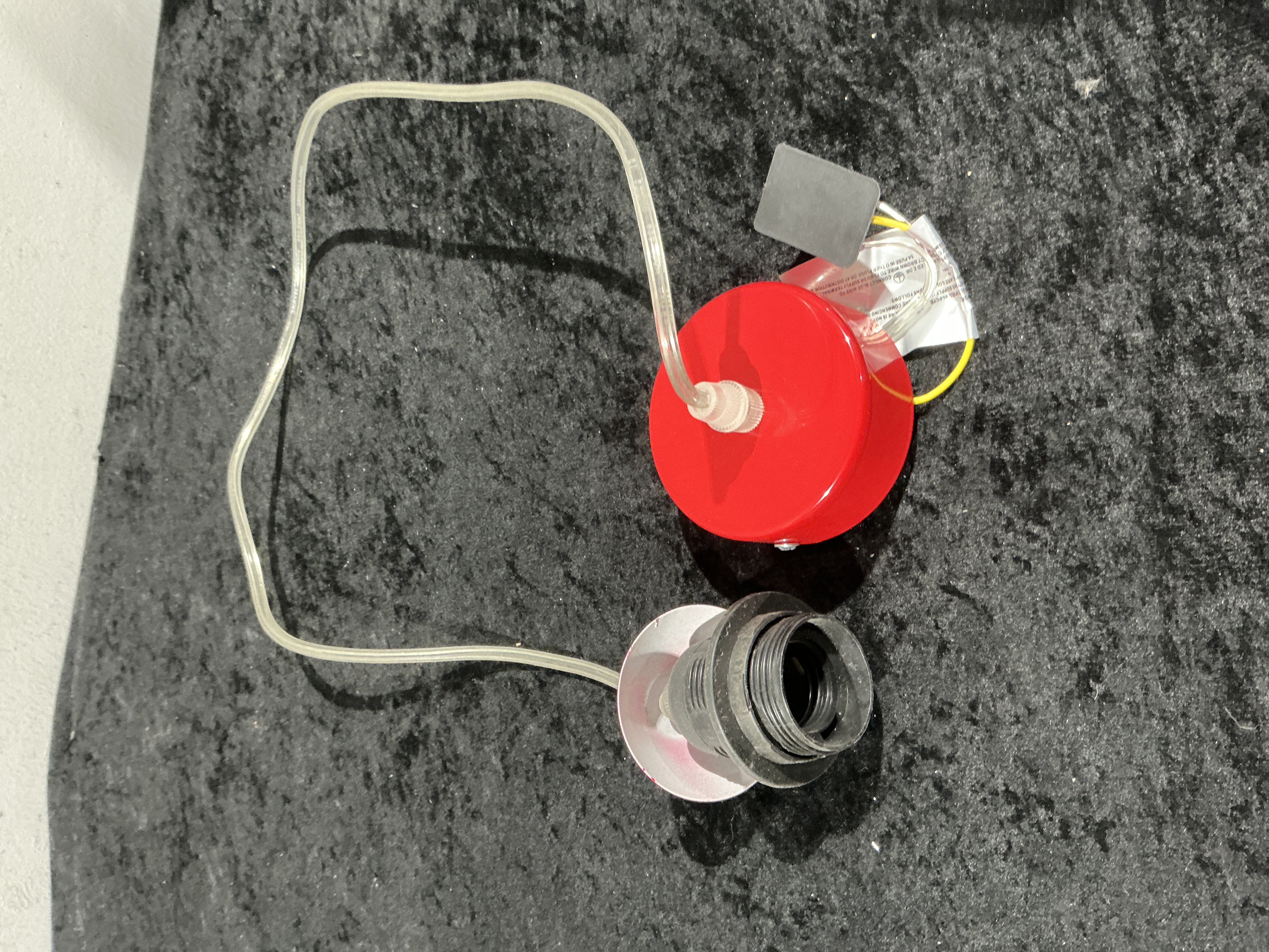 A collection of 50 contemporary pendant light fitting assemblies, supplied in disassembled components suitable for installation. Each assembly includes a circular ceiling canopy constructed of metal with a glossy red enamel finish, a black plastic screw-in lamp holder, and a length of clear plastic-sheathed electrical cable. Also included are ancillary installation components such as a small black plastic connection block and accompanying paper instruction tags. Visible text on the tags references electrical safety and installation details, including instructions to CONNECT BLUR WIRE TO TERMINAL and the requirement for a 2A FUSE. The lot is sold as 50 complete, unassembled units.