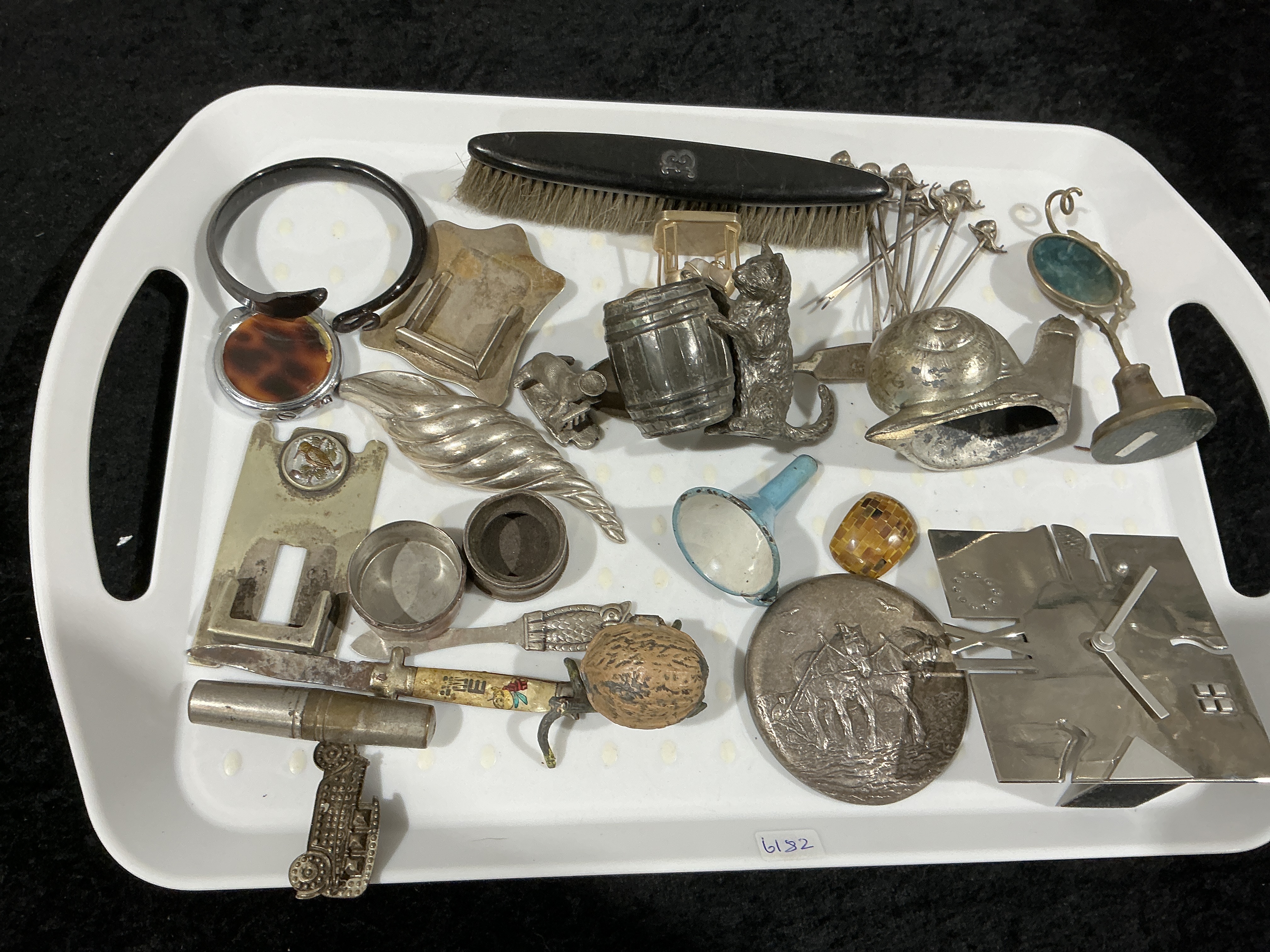 This is a mixed lot comprising 32 individual vintage and antique smalls and novelty items presented on a white serving tray. The collection features a wide variety of materials including silver-toned and brass metals, plastic, wood/bristle, enamel, and stone or glass elements. The overall composition aligns with market categories for small silver novelties and vanity items, as suggested by web research. Notable items include a black-handled brush with visible marking ’83’ or ‘B3’, a black plastic bangle or ring, a tortoiseshell-pattern compact, and a figural metal piece depicting a cat standing next to a barrel. Also present is a large round medallion embossed with a classical scene featuring a chariot and figures, and a group of fifteen silver-toned cocktail picks. Functional pieces include a small blue and white enamel funnel, a folding knife with a decorated handle featuring stylized script and a figure, a novelty nutcracker made from a walnut shell, and various openers and clips. A modernist silver-toned desk object shaped like a house or abstract structure is also included, alongside a small mirror on a stand and a twisted shell-form object. The silver-toned items exhibit heavy tarnish consistent with age, suggesting they may be silver plate, weighted sterling, or base metal.
