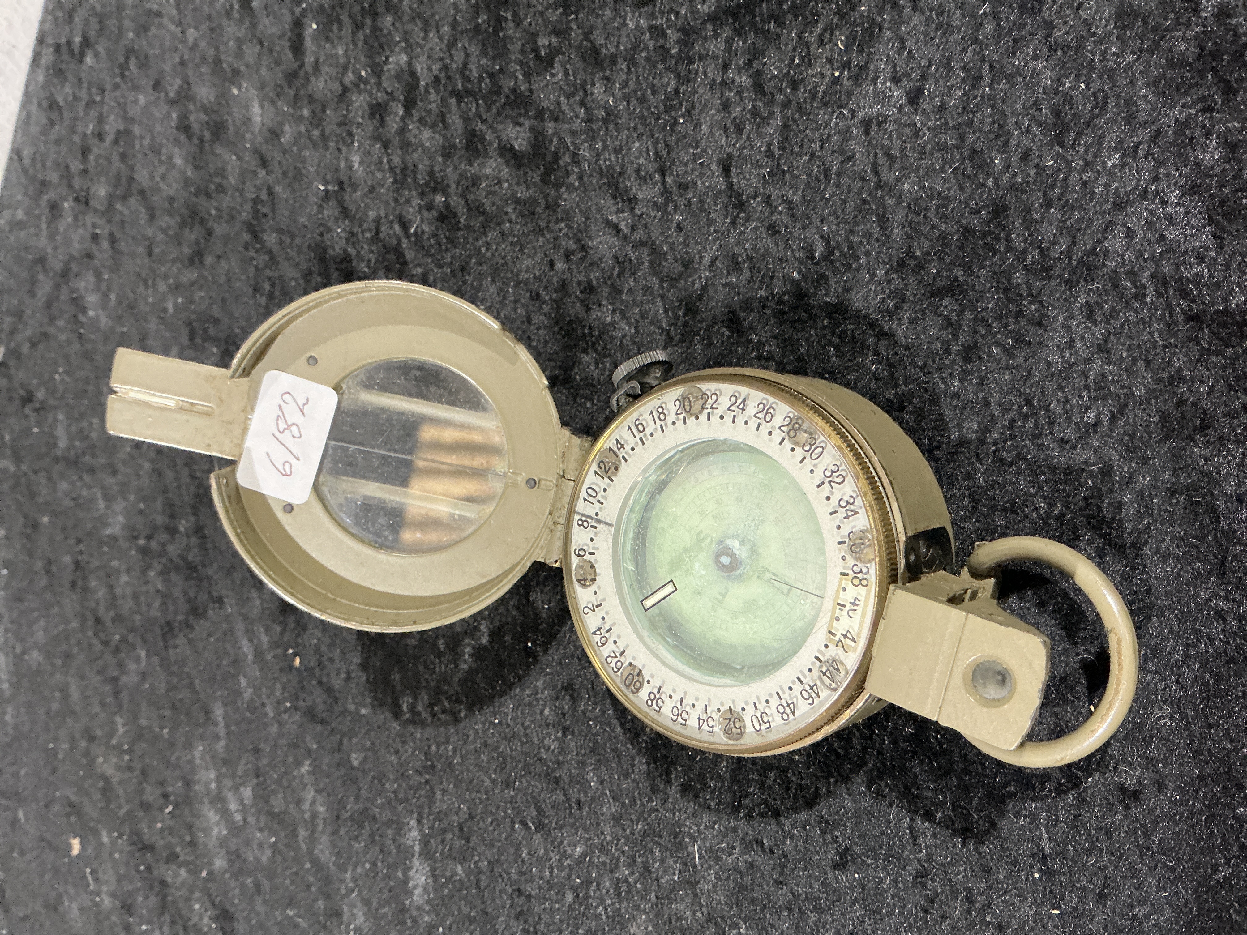 A single military-style lensatic marching compass constructed of painted metal in a matte khaki/olive drab finish. This type of field equipment, while functionally ,prismatic models like the Stanley London compass, is designed for rugged military use. The compass features a hinged protective cover/sight with an internal sighting wire, a rotating bezel marked primarily in mils (visible numerical markings ascend to 64), and a hinged rear sighting assembly incorporating a magnifying lens. The inner dial exhibits a pale green coloration, indicative of a luminous material for low-light use. The exterior base is marked with partial manufacturer details including “TAYLOR,” “ROCHEST[ER],” and the potential federal stock number “8050-593-9439.” A modern adhesive label bearing the number ‘6182’ is affixed to the interior of the lid.