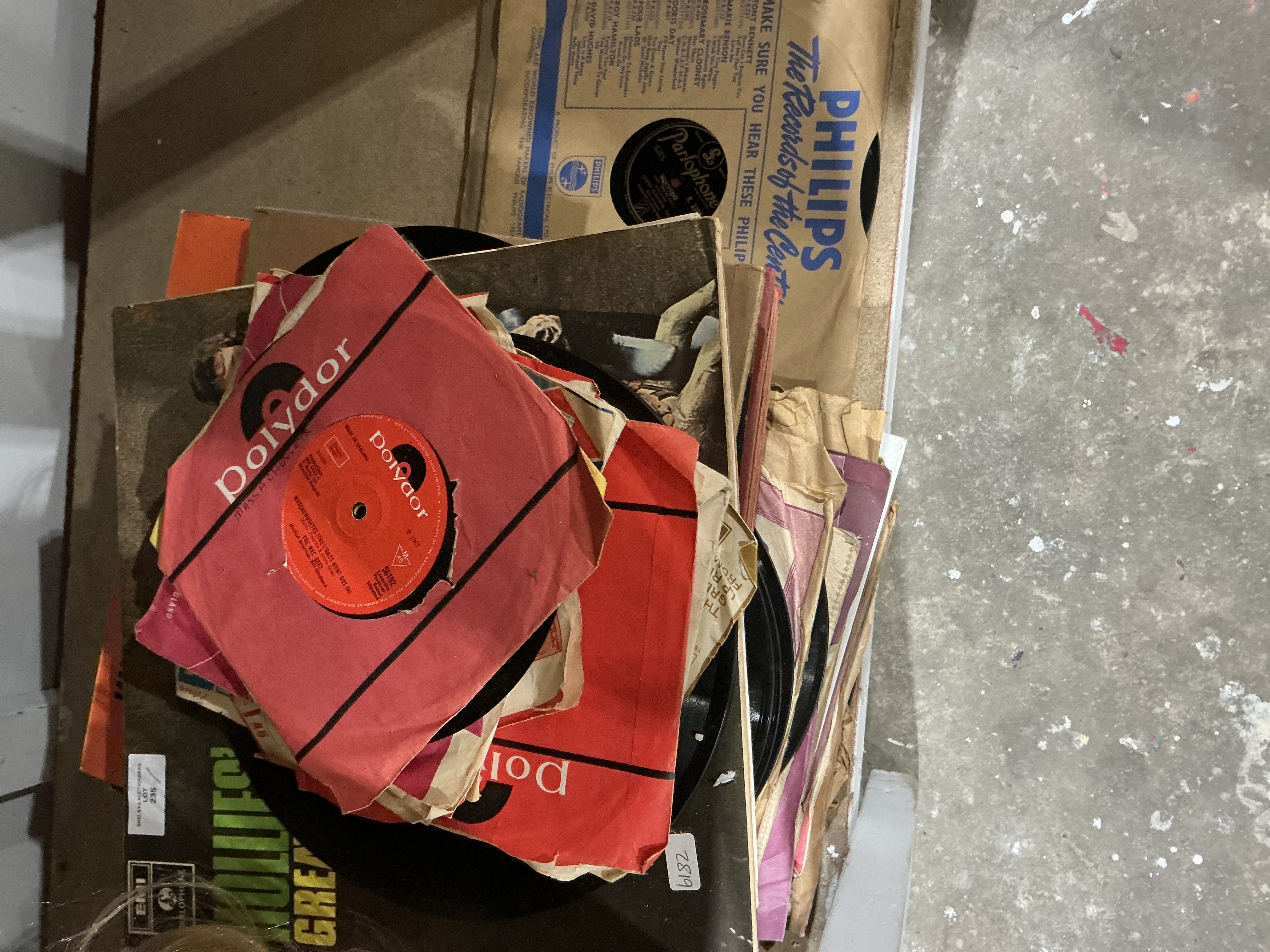 A mixed lot of vintage vinyl phonograph records comprising both Long Play (LP) albums and 45 rpm singles, housed in assorted paper and cardboard sleeves. The lot includes items bearing major record label branding such as Polydor, Philips, EMI, and Parlophone. Visible contents include a dark green LP jacket labeled HOLLIES and a Polydor 45 rpm single dated 1967, featuring the title MASSACHUSETTS. Another visible sleeve, branded Philips, is titled The Records of the Century and lists artists including Tony Bennett and Rosemary Clooney. A record with a Parlophone label is also visible. The lot is identified by an auction sticker reading SHELBYS AUCTIONEERS LOT 235 and an inventory tag 6182.