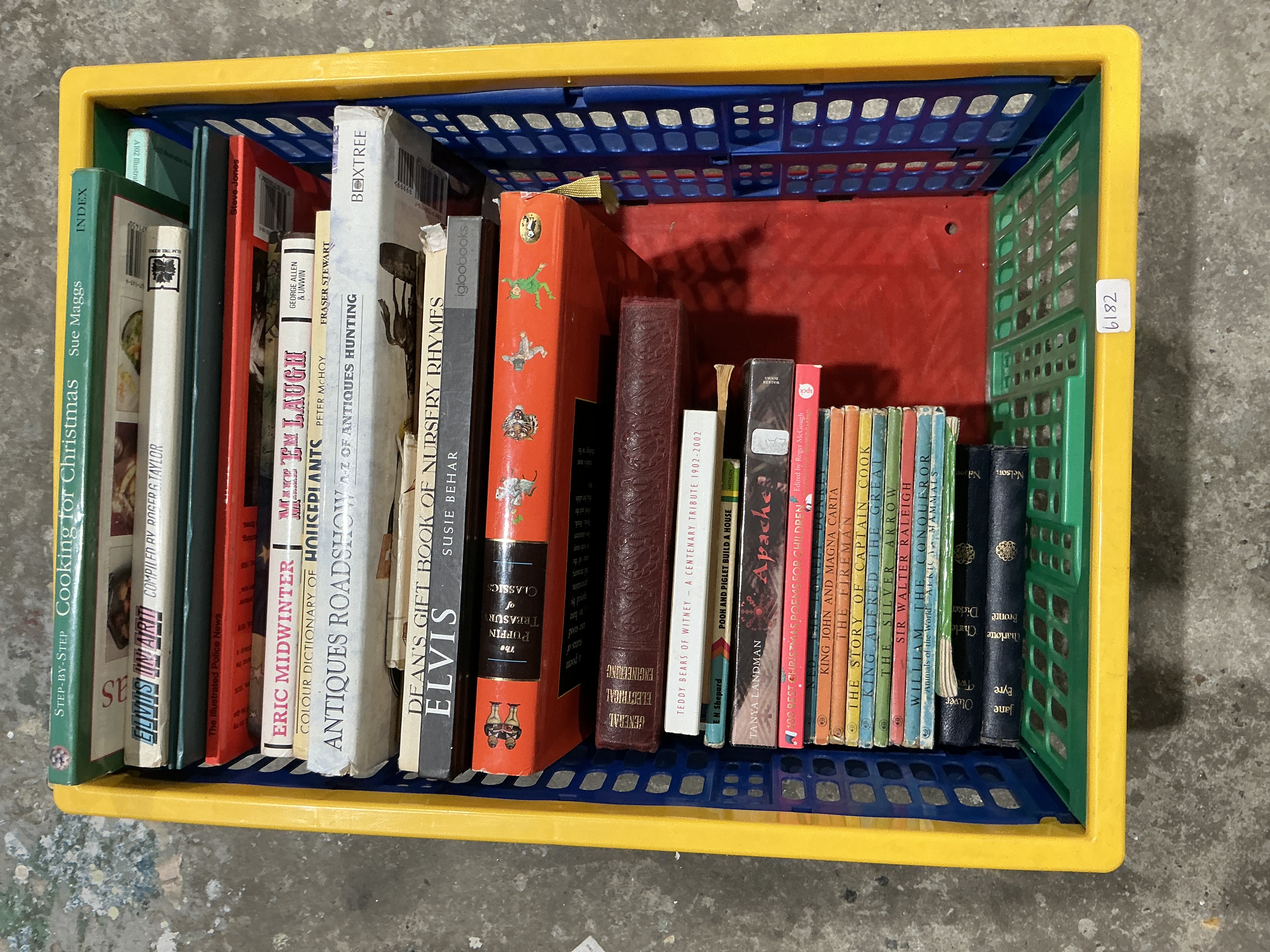 A collection of 26 assorted hardback and softback books housed within a multi-colored plastic storage crate. The crate features a yellow frame, blue side panels, and red and green interior components, and bears an affixed label marked 6182. The collection spans multiple genres including lifestyle (Cooking for Christmas, Colour Dictionary of Houseplants), reference (Antiques Roadshow A-Z of Antiques Hunting), biography (Elvis by Susie Behar), children’s literature (Dean’s Gift Book of Nursery Rhymes, Puffin Treasury of Classics), and thin-spined historical/classic storybooks (Sir Walter Raleigh, William the Conqueror, King John and Magna Carta, Oliver Twist, Jane Eyre). Binding materials are mixed, including paper, cardboard, and cloth or faux leather, with some spines featuring gilt lettering.