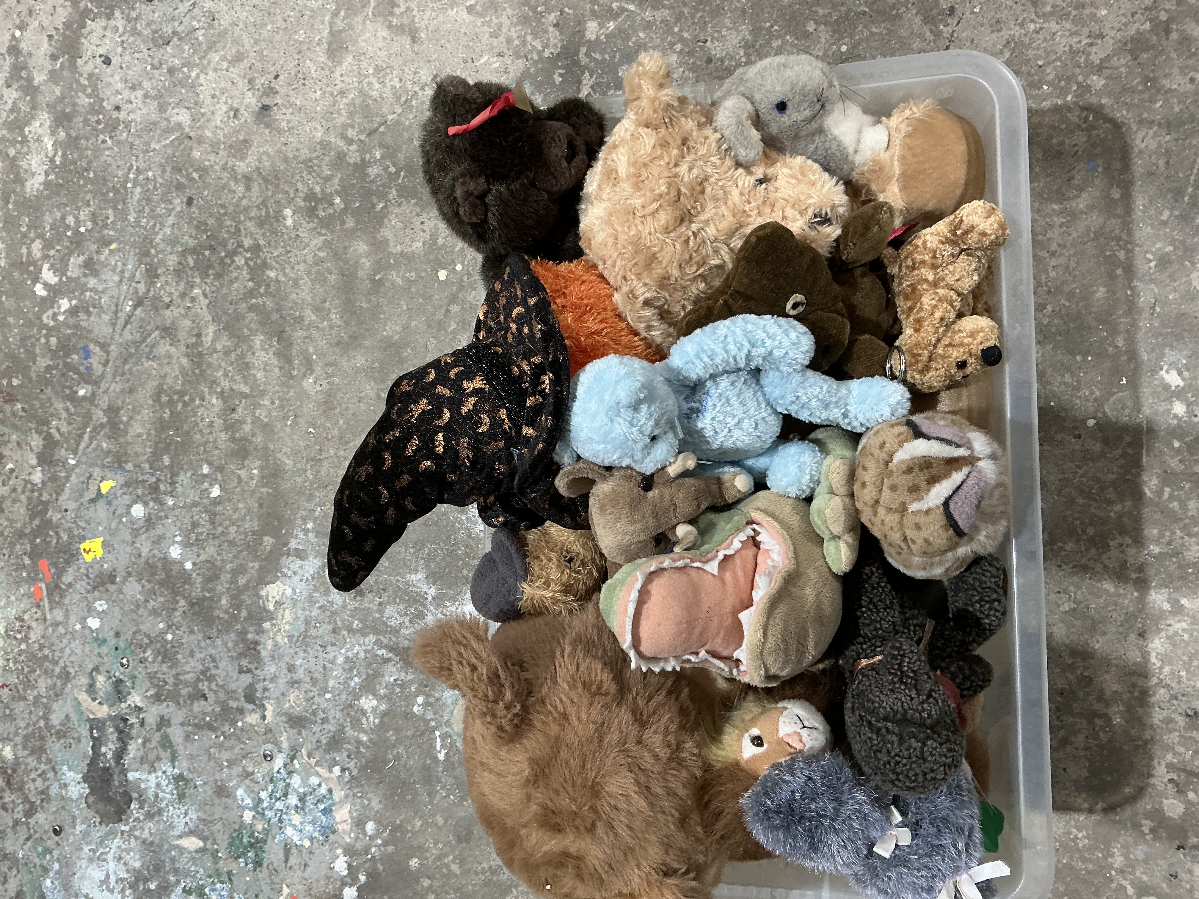 A collection of 17 miscellaneous modern plush toys and novelty items, primarily constructed from synthetic fiber materials, contained within a clear plastic storage bin. The assortment includes various stuffed animals such as teddy bears, rabbits, a small elephant, a lion head, and a large plush crocodile or alligator with an open mouth. One light blue teddy bear is embroidered with the text “My First Bear” on its chest. Also included is a novelty black witch’s hat decorated with shimmering gold glitter leopard spot patterns. The plush figures are of various colors including tan, brown, grey, and light blue.