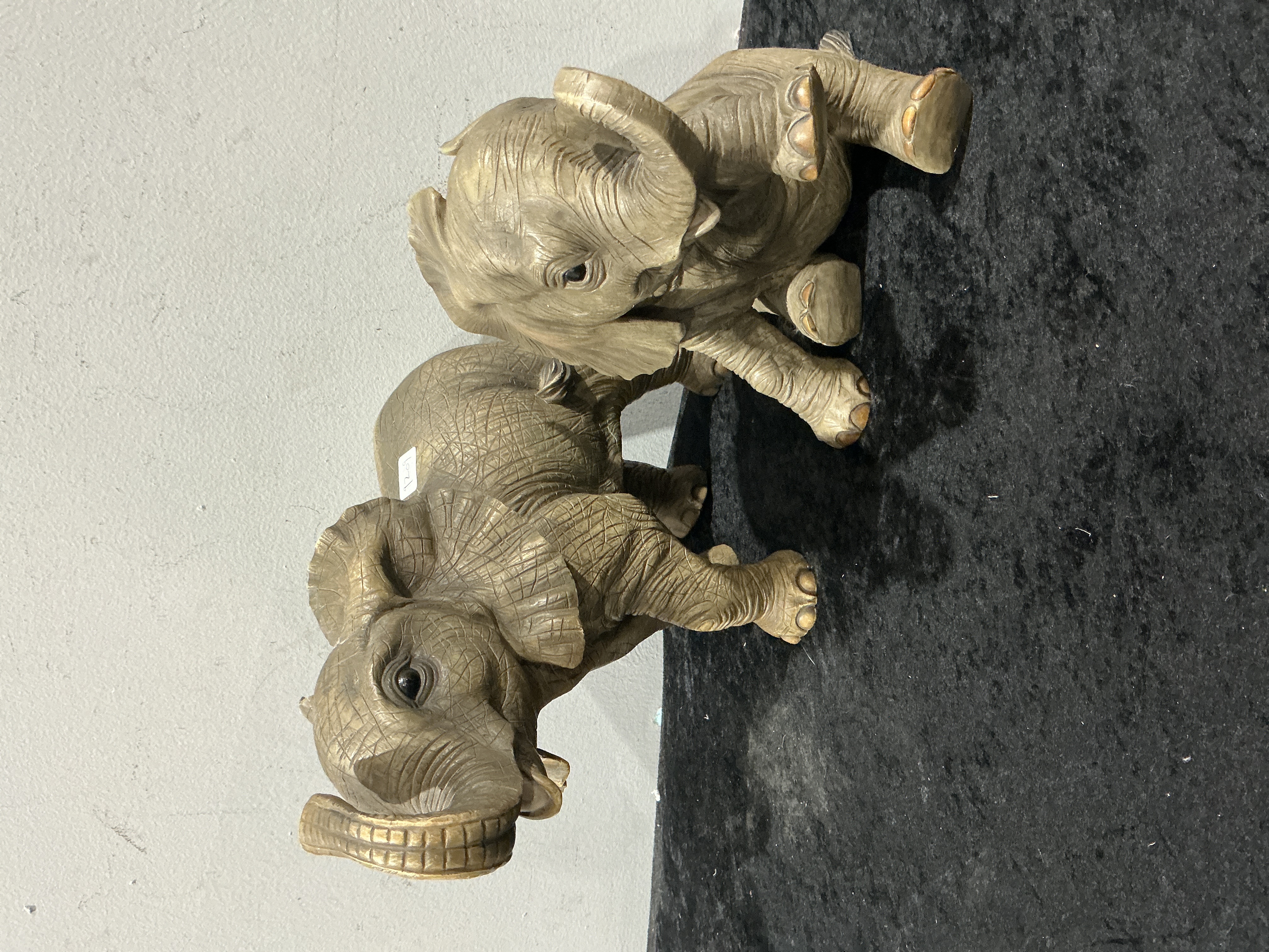 A pair of decorative elephant calf figurines rendered in a naturalistic, textured style. The figures are constructed from a molded composite material or resin, finished in an earthy brown and golden-taupe palette. The lot comprises two distinct poses: one elephant standing with its trunk raised, and the second depicted in a kneeling or sitting position. Both figures exhibit highly detailed, wrinkled skin textures, with golden accents applied to the tips of the trunks and the hooves. An adhesive inventory sticker marked 1209 is affixed to the back of the standing figure.