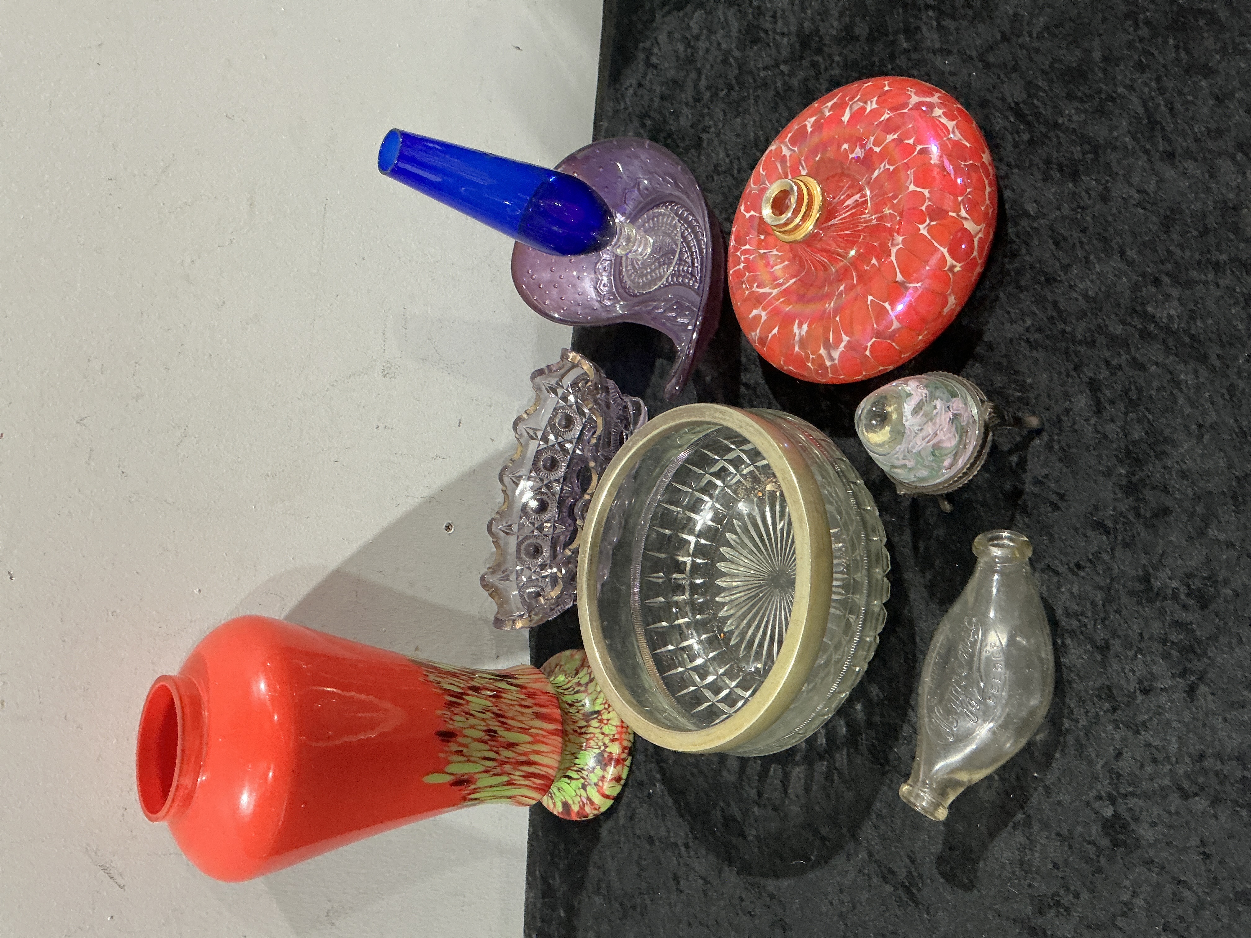 The collection consists of eight assorted vintage and antique glass objects, primarily decorative tableware and scent vessels. The central piece is a clear, heavy cut or pressed glass bowl featuring a diamond and fan pattern, set within a simple metallic or silver-plated rim band. Also included is a tall, opaque red glass vase with a flared rim and a tapering body, decorated near the foot and base with green and red splatter decoration. A small, oval amethyst pressed glass dish is present, characterized by a scalloped, gilt rim. The collection also features three distinct colored glass vessels: a flattened, circular red and white spatter art glass item with a brass collar opening, likely a scent or powder jar base; a purple bubble glass inkwell or scent bottle base mounted with a contrasting cobalt blue tapered glass stopper; and a small clear glass flattened phial embossed with partially legible text including the name FELDOB. The final item is a small, domed glass paperweight containing colorful internal decoration, set upon a dark metal tripod stand.