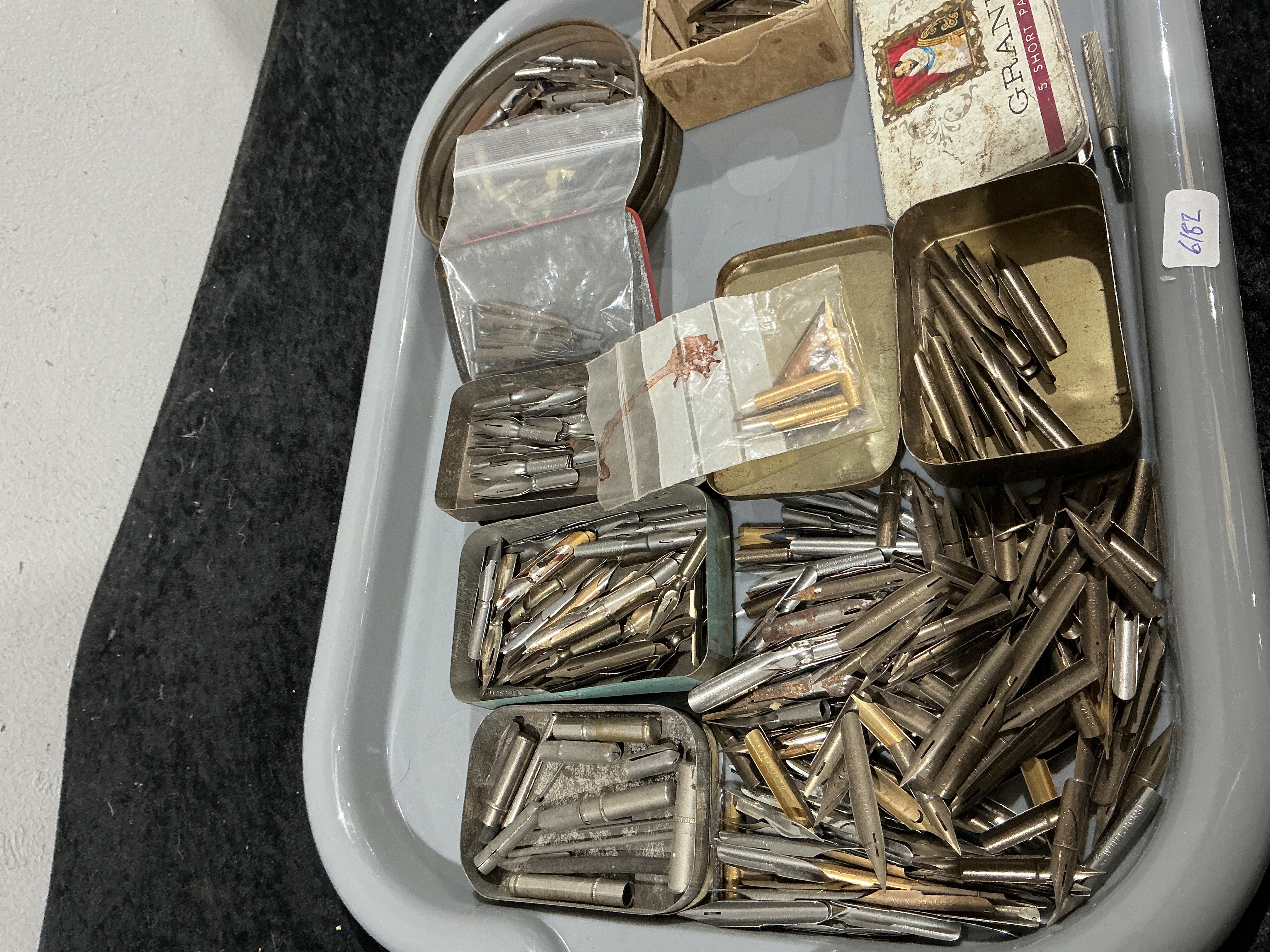 A large collection of approximately 250 vintage dip pen nibs and related metal writing components, housed loosely within several small metal tins and one cardboard box, all contained within a larger gray enamel tray. The nibs are primarily composed of steel and brass-toned metal, representing various styles suitable for calligraphy and general writing. Visible manufacturer markings include “WHITE HORSE” and “N.Y. BACHELLE.” The lot includes a knurled miniature pen holder component and several storage tins. One rectangular tin lid is present, marked “GRAN[T]” featuring a pictorial portrait of a bearded man. A white sticker bearing the handwritten number “6182” is affixed to the edge of the gray tray.