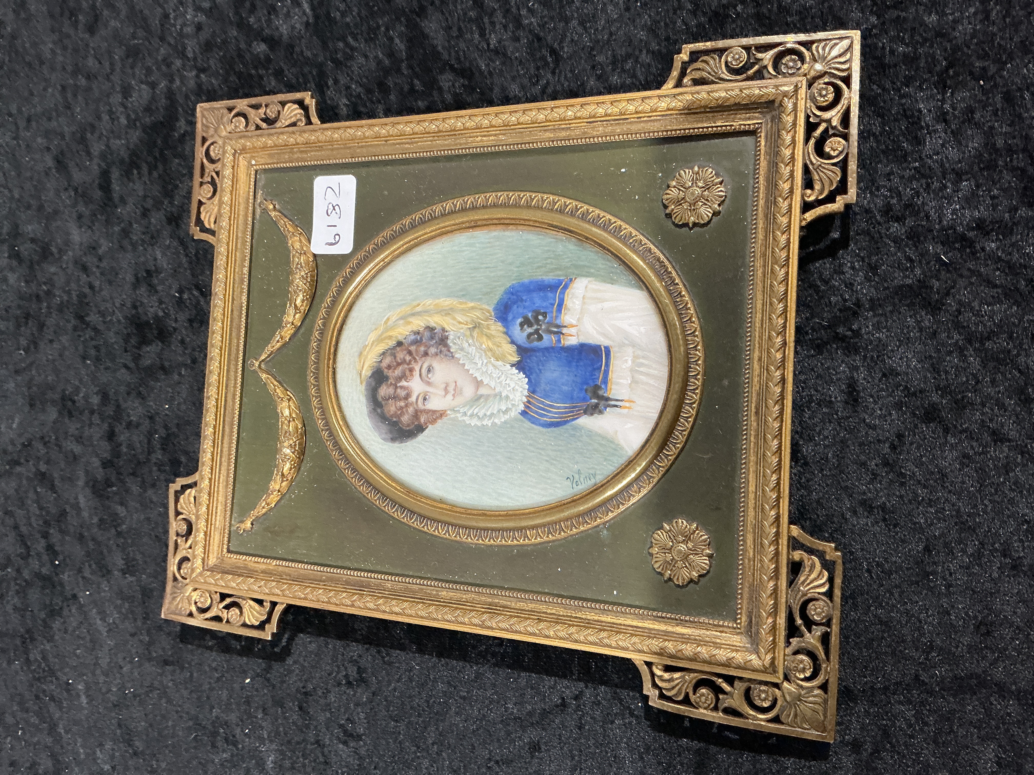 A single antique miniature portrait painting of a lady, executed on a light support, likely ivory or thin material. The style is consistent with the Regency or Romantic period, often marketed as a Victorian miniature painting. The bust-length subject has tightly curled hair and wears a bright blue jacket, a ruffled white ruff collar, and a dark hat adorned with a prominent yellow feather. The background is light blue. A faint signature, appearing to read Valiny or Valery, is visible on the background near the subject’s left shoulder. This piece has been associated with the keyword interpretation signed volnov. The oval miniature is set within a gilt metal bezel and mounted on a dark olive green matte board. The matte is decorated with applied gilt metal ornaments, including swags and rosettes. The entire assembly is housed in a rectangular gilt metal frame featuring detailed foliate scrolling and openwork extensions at the corners and base. A white adhesive sticker bearing the number 6182 is affixed to the green matte.