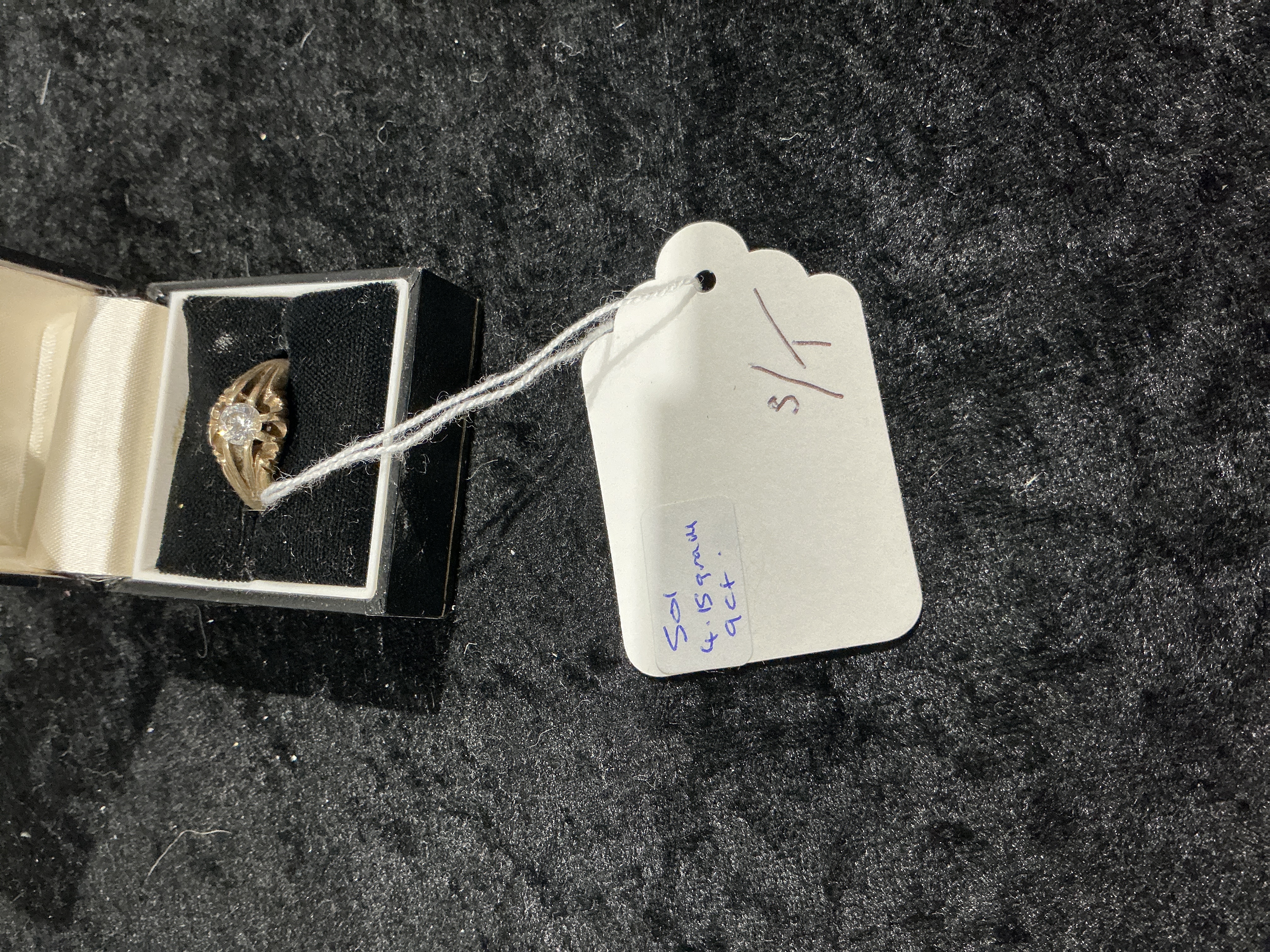 A lot comprising three items: a 9ct gold inset ring, a presentation box, and an attached inventory tag. The yellow metal ring is styled as a solitaire or cluster, featuring a central round-cut colorless stone mounted in a decorative, pierced setting with split shoulders. The ring is presented inside a small, hinged black jewelry box lined with black velvet and white satin. The attached white scalloped inventory tag bears handwritten notes specifying the item as “Sol” (solitaire), weighing “4.15 gram,” and composed of “9ct” gold. The ring exhibits a vintage or revival design consistent with market comparables for yellow gold diamond accent rings.