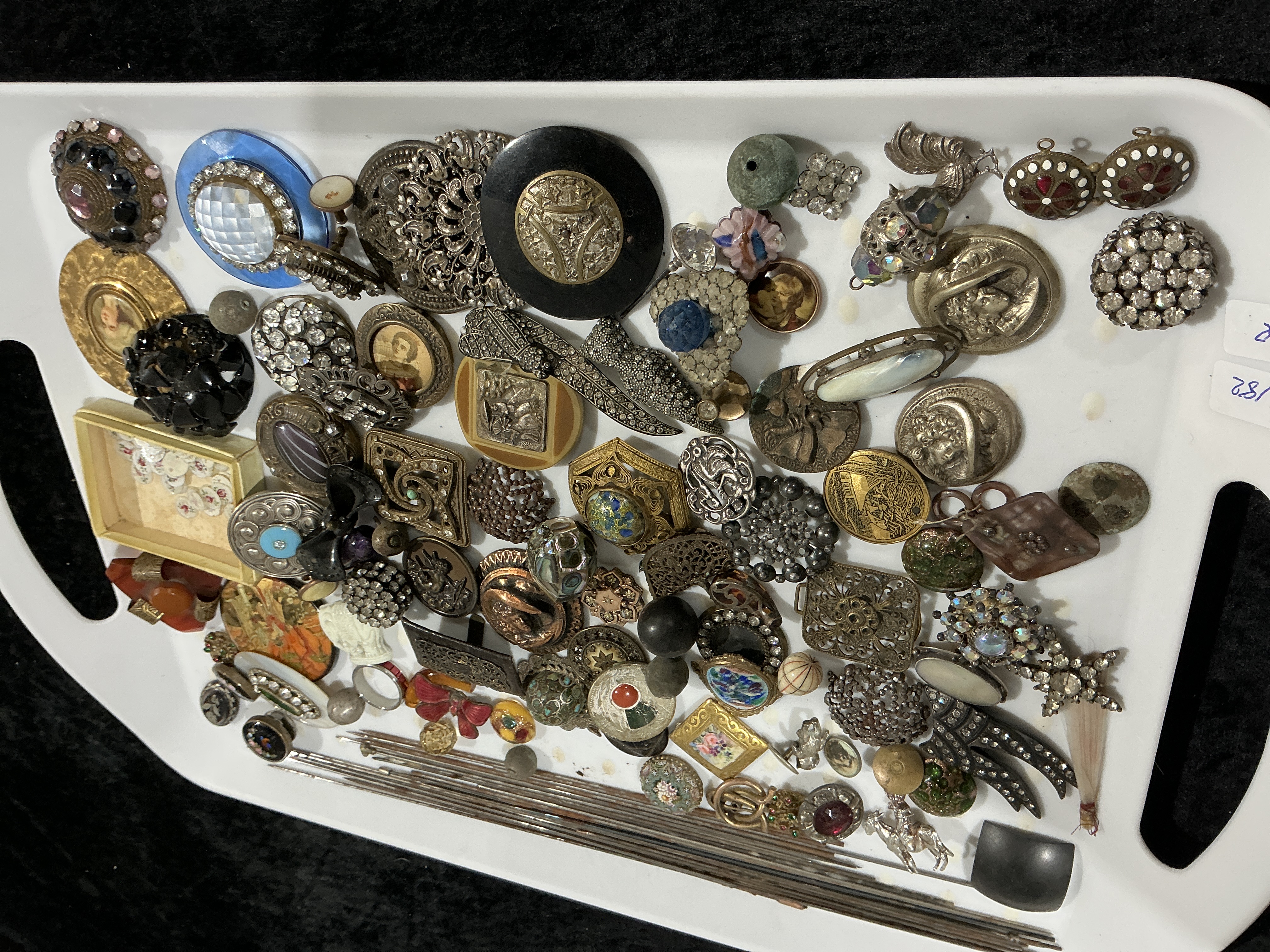 A Collection of 63 Vintage and Antique Hat Pin Tops Etc